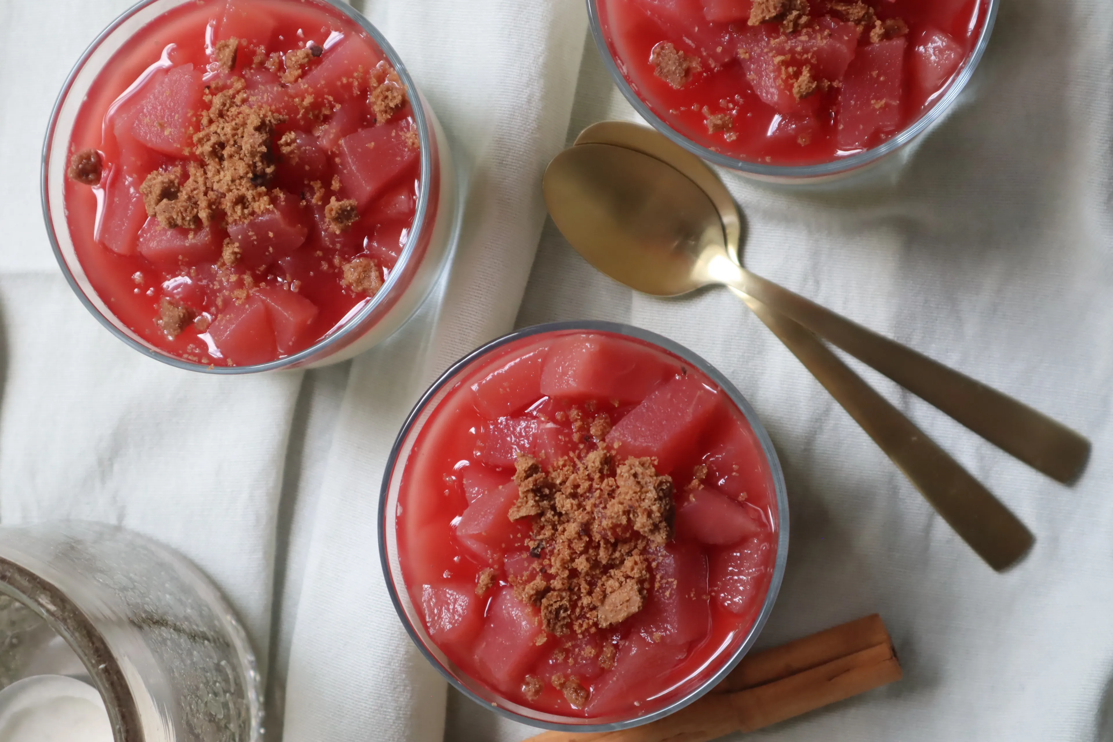 Snijd de stoofperen in mooie blokjes. Verwarm ongeveer driehonderd milliliter stoofperensap op laag vuur. Voeg de gelatine toe en laat dit oplossen. Voeg de blokjes stoofpeer toe en laat het geheel iets afkoelen. Schep de blokjes stoofpeer met een beetje sap op de panna cotta’s en laat vervolgens opnieuw drie uur opstijven.
