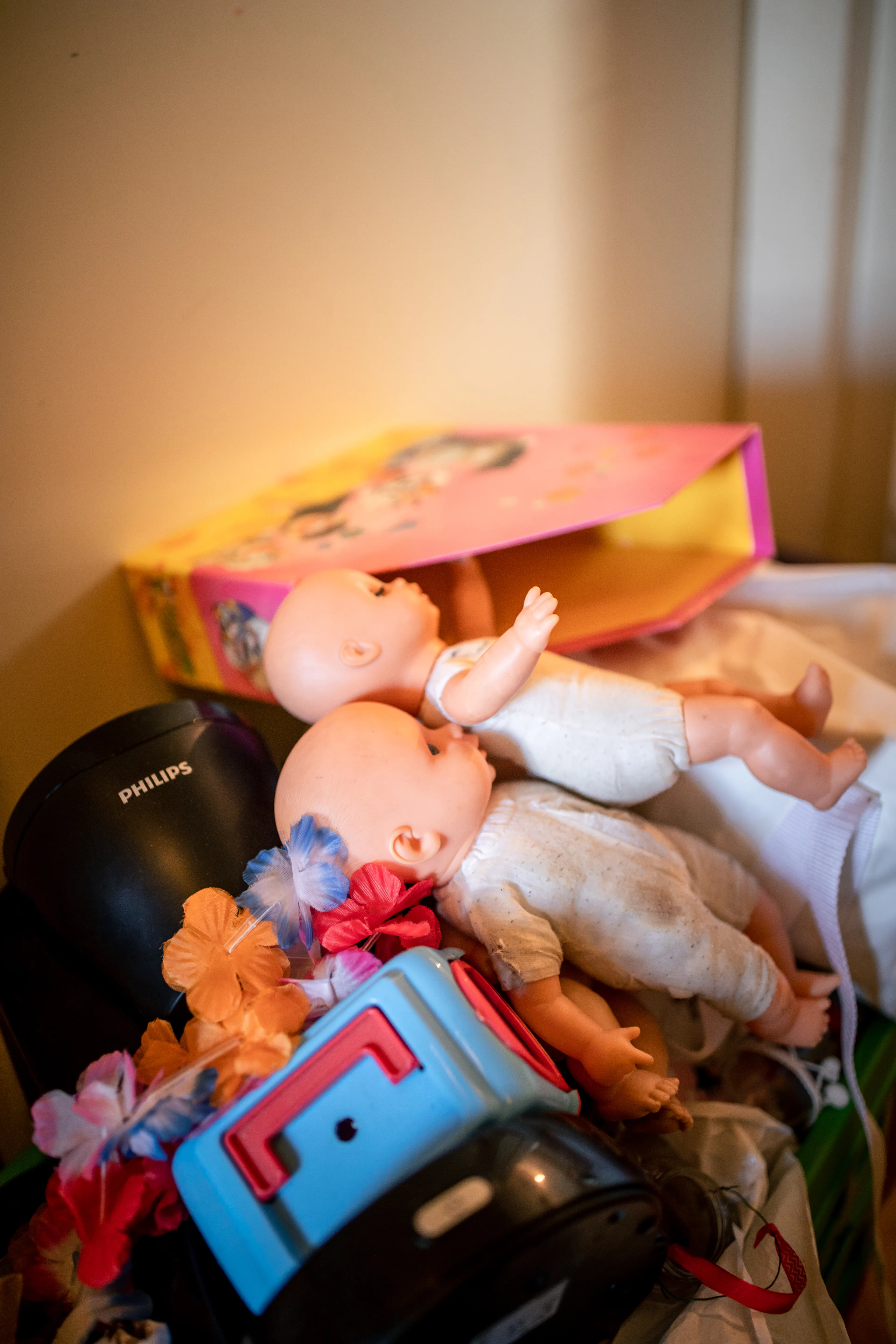 Even later schuift Christine een blauwe bak bomvol kleine spulletjes naar zich toe. Ze zit op haar knieën en moet uitkijken dat ze haar hoofd niet stoot tegen de lage balken. “Ai,” zegt ze, terwijl ze een vies gezicht trekt, “hier hebben de muizen aan gevreten. Dit zoek ik later uit.” “Nee,” zegt Esther beslist, “dat gaan we nu doen. Want straks staat deze hele ruimte vol met ‘later uitzoeken’.” “Maar dat kost zo veel tijd”, werpt Christine tegen. Toch is Esther onvermurwbaar. “Oké,” zegt Christine, “ik haal er vijf dingen uit die ik wil bewaren, de rest gaat weg.” “Goed plan”, vindt Esther, en Christine graait in de bak met duplopoppetjes, kleine handpopjes, stickers en ander klein grut. Ze vist er een paar poppetjes en een zakmes uit en telt hardop. “O, ik haal er ook vijf dingen uit voor anderen”, zegt ze, terwijl ze exemplaar zes en zeven op een tafeltje zet. “Je verandert de spelregels, hè,” zegt Esther, “heb je dat door?” Christine kijkt op en zegt: “Wat waarde heeft, wil ik niet zomaar weggooien.” “Maar wat is ‘waarde’?” vraagt Esther, waarop Christine resoluut de bak in de vuilniszak leeg kiepert.