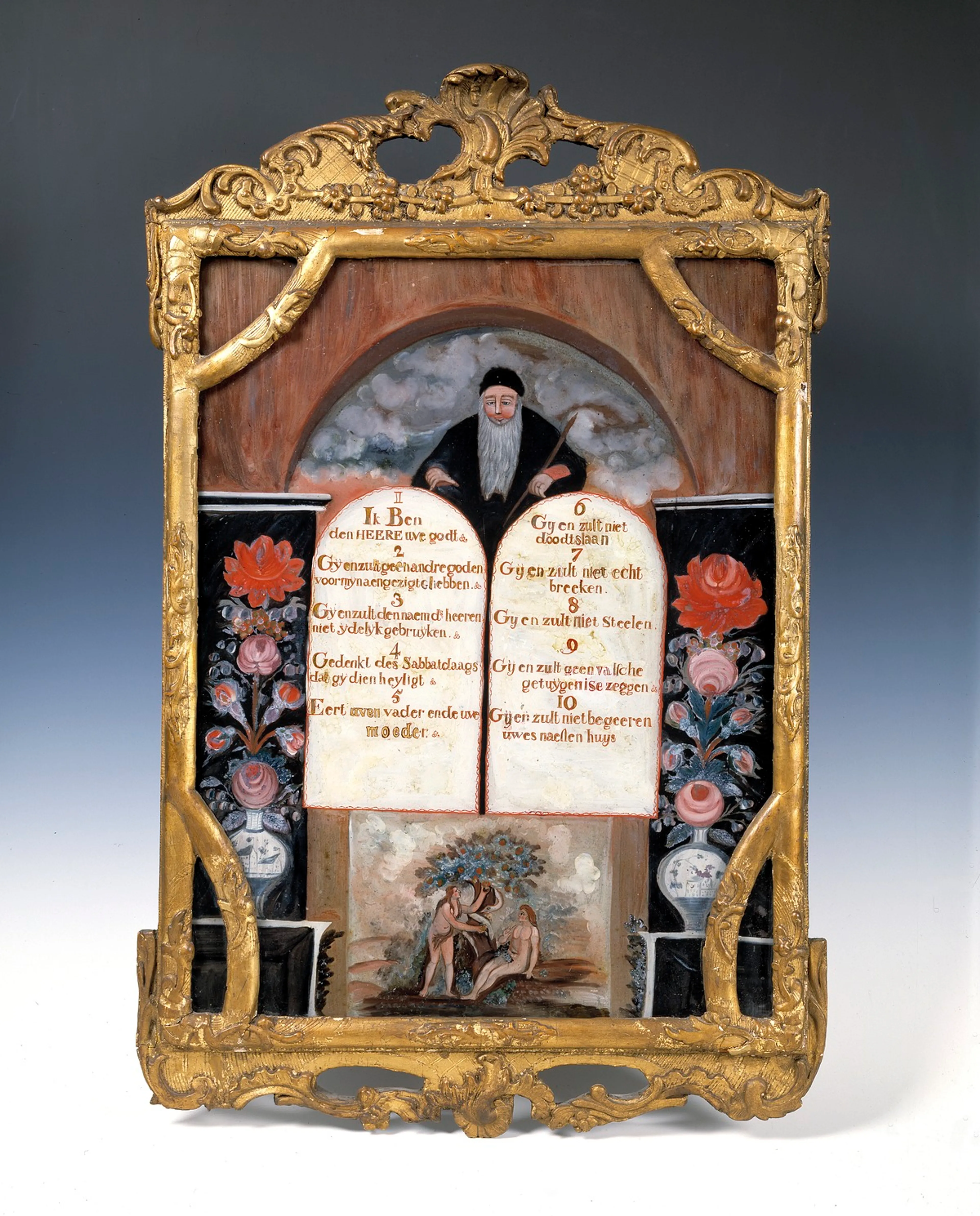 De gebodenborden werden niet alleen voor de kerken gemaakt, maar hingen ook bij mensen thuis. Onder de tafelen staat de scene van de zondeval geplaatst, het moment dat Eva een appel uit de boom plukt en deze aan Adam overhandigd. Door de zondeval, door de zondigheid van de mens zijn de leefregels als vermeld op de tafelen nodig.