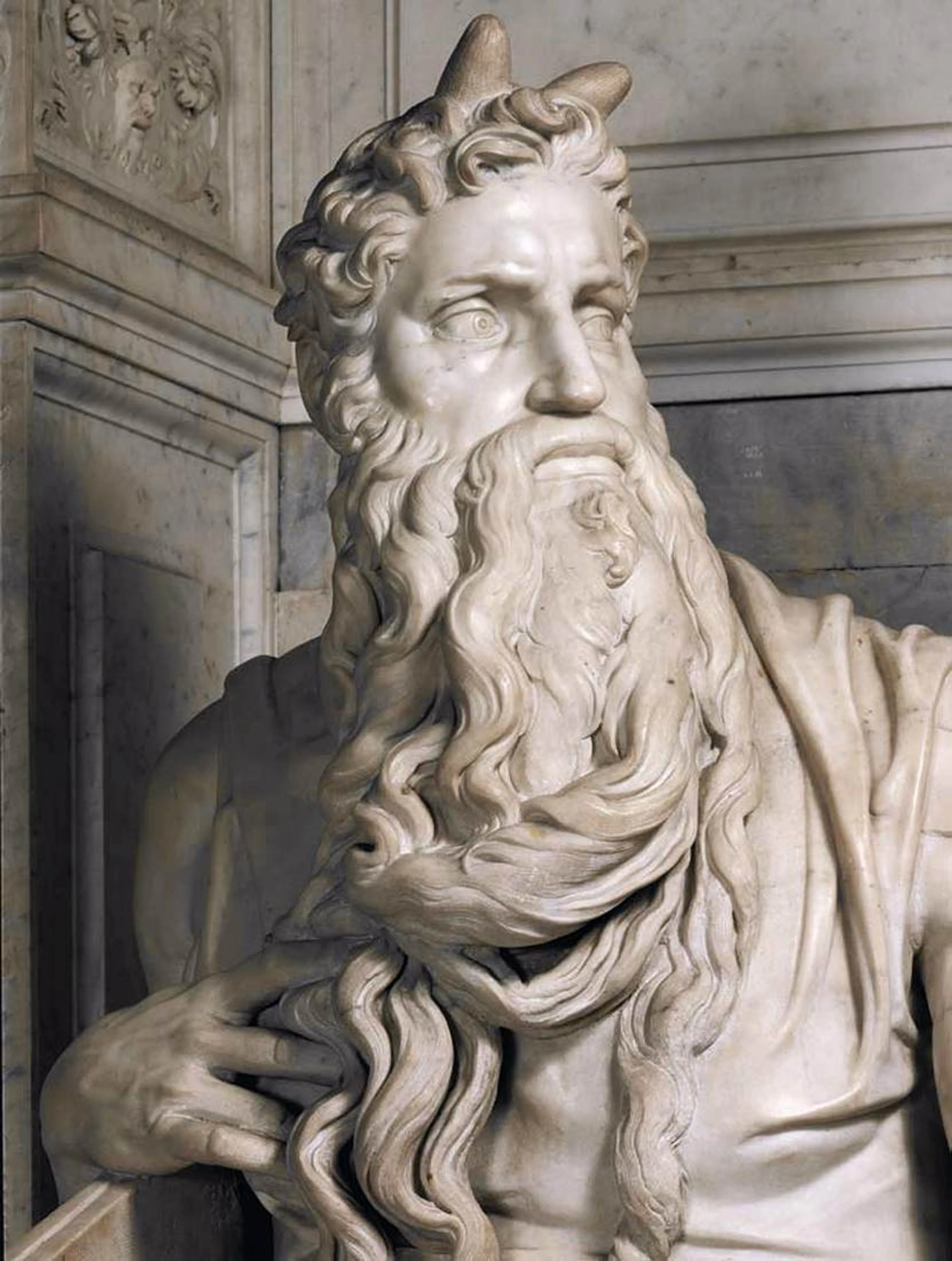 Zie bijv. Mozes van Michelangelo. Grafmonument voor Paus Julius II, c.1513-45. S. Pietro in Vincoli, Rome.