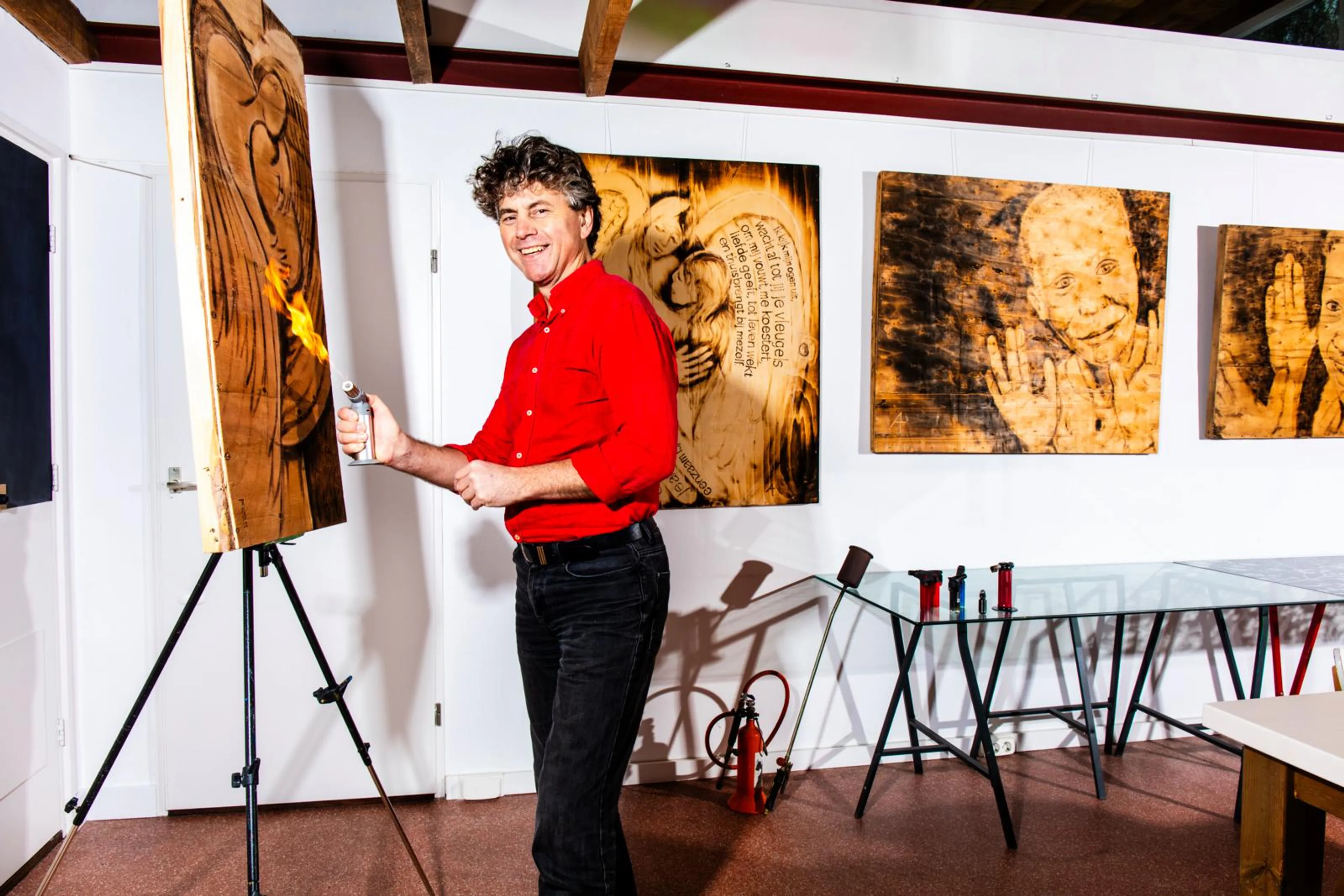 “Na een reis door Zuid-Afrika ben ik portretten gaan maken van Zuid-Afrikaanse kinderen. Ik doe dit door te schilderen met vuur. In plaats van papier gebruik ik afvalhouten platen van handelskisten uit China. In die platen zit een bijzondere nerf die ik heel mooi vind. Het hout heeft daardoor zelf al een heel verhaal, waar ik me ook deels door laat inspireren. Ik gebruik verschillende branders, die je kunt zien als mijn penselen. Denk hierbij aan crème brûléebranders en dak- en soldeerbranders. De kunst is om met de vlam niet het hout te raken, maar het hout te verhitten, waardoor het verkleurt, maar niet in de fik vliegt. De grootste branders gebruik ik buiten, want binnen zou dat te gevaarlijk zijn.”