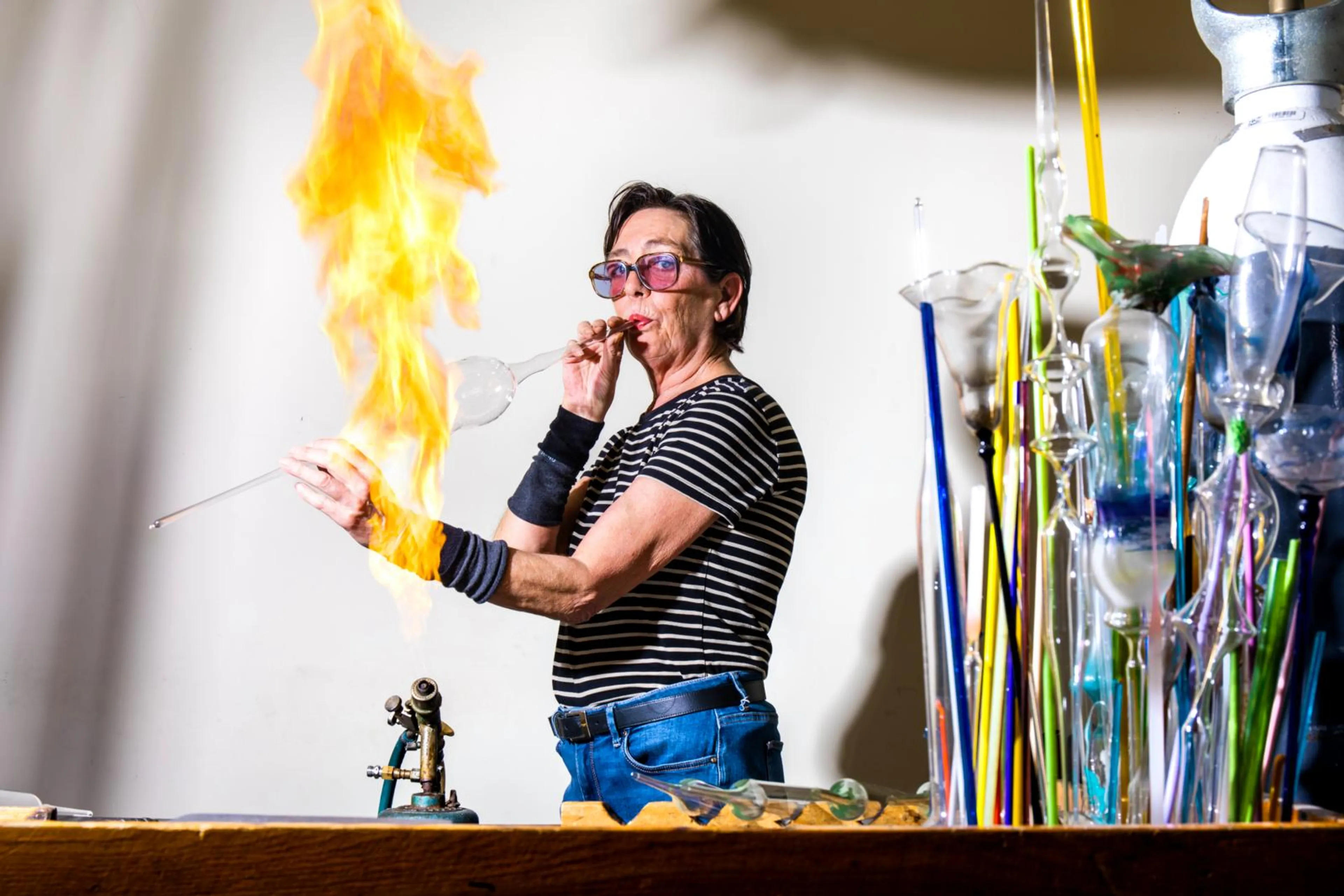 “Vuur is voor mij een scheppend element. Als glasblazer breng ik glas tot leven door het in een vlam te houden, te draaien en te blazen. Zolang m’n vingers het blijven doen, ga ik ermee door. Toen ik net begon, verdiende ik bijna niks. Er ging een tijd overheen voordat ik bekend was in het vak. Het was hard werken, maar ik bleef volhouden. Die passie voor glasblazen kreeg ik met de paplepel ingegoten, het vak zit namelijk in mijn familie. Mijn moeder, mijn opa en zijn opa waren allemaal glasblazer. Er zitten aan dit vak ook risico’s; zo heb ik een paar keer flink mijn vingers verbrand. Het vuur, het glas en ikzelf zijn een soort eenheid. We hebben elkaar nodig.”