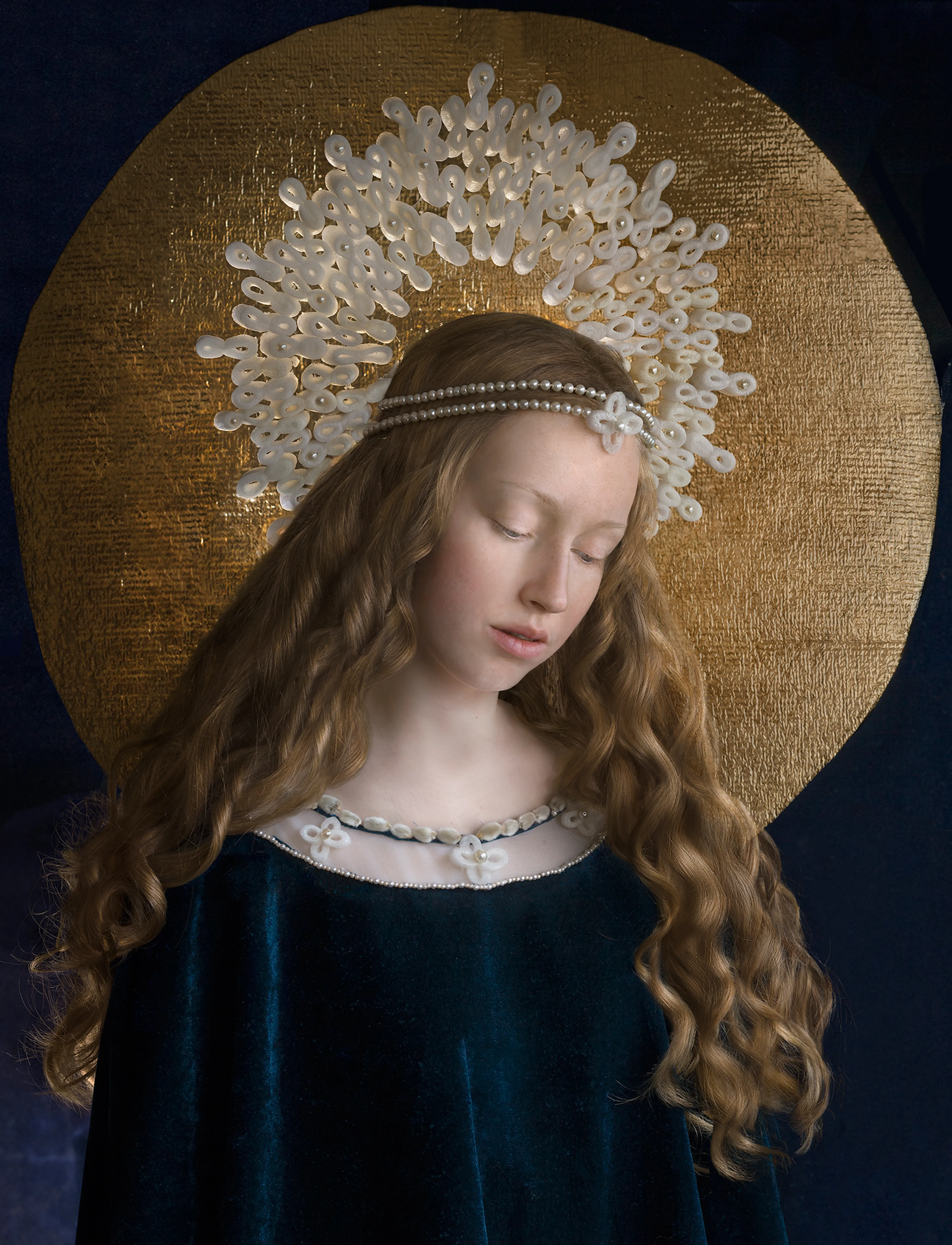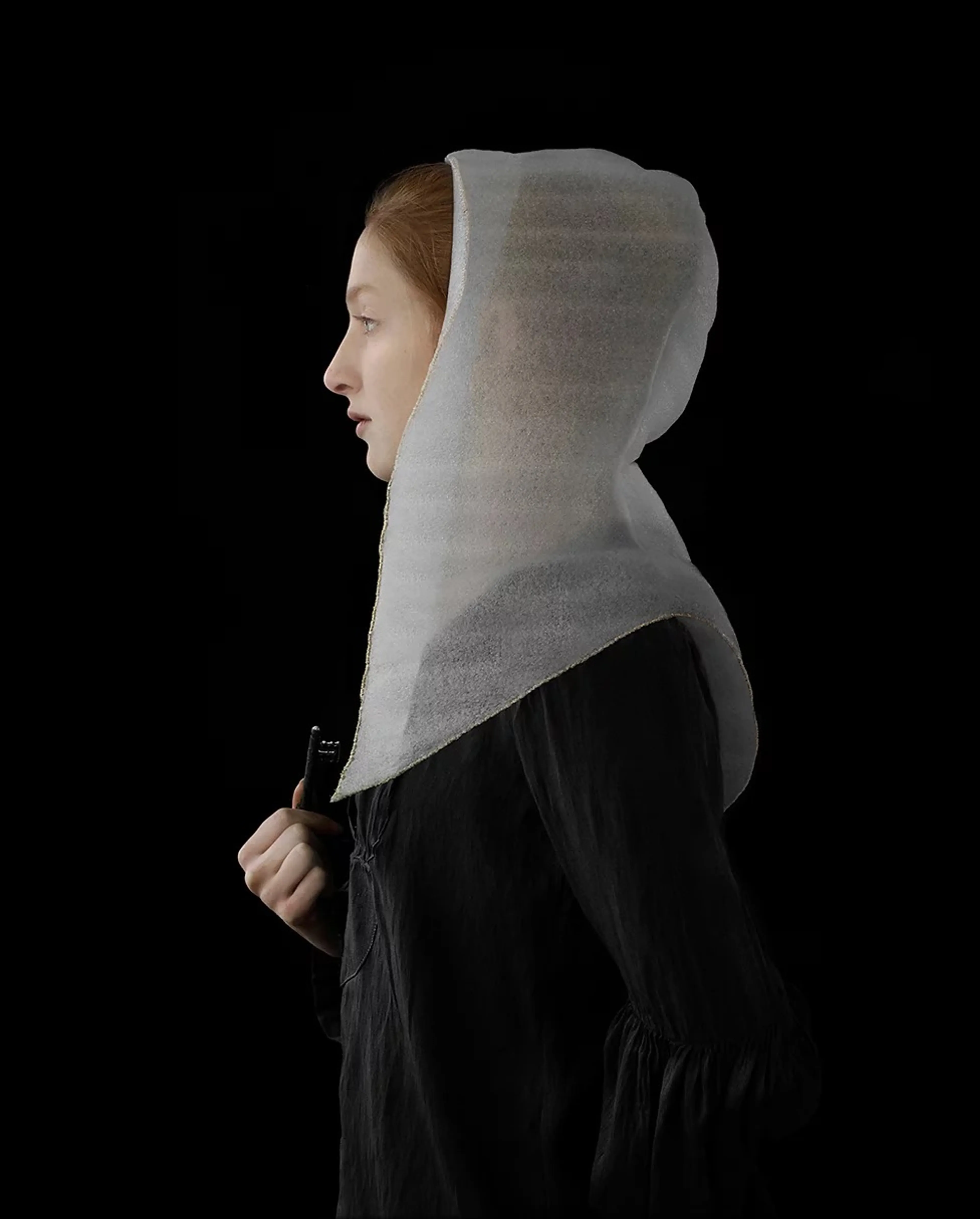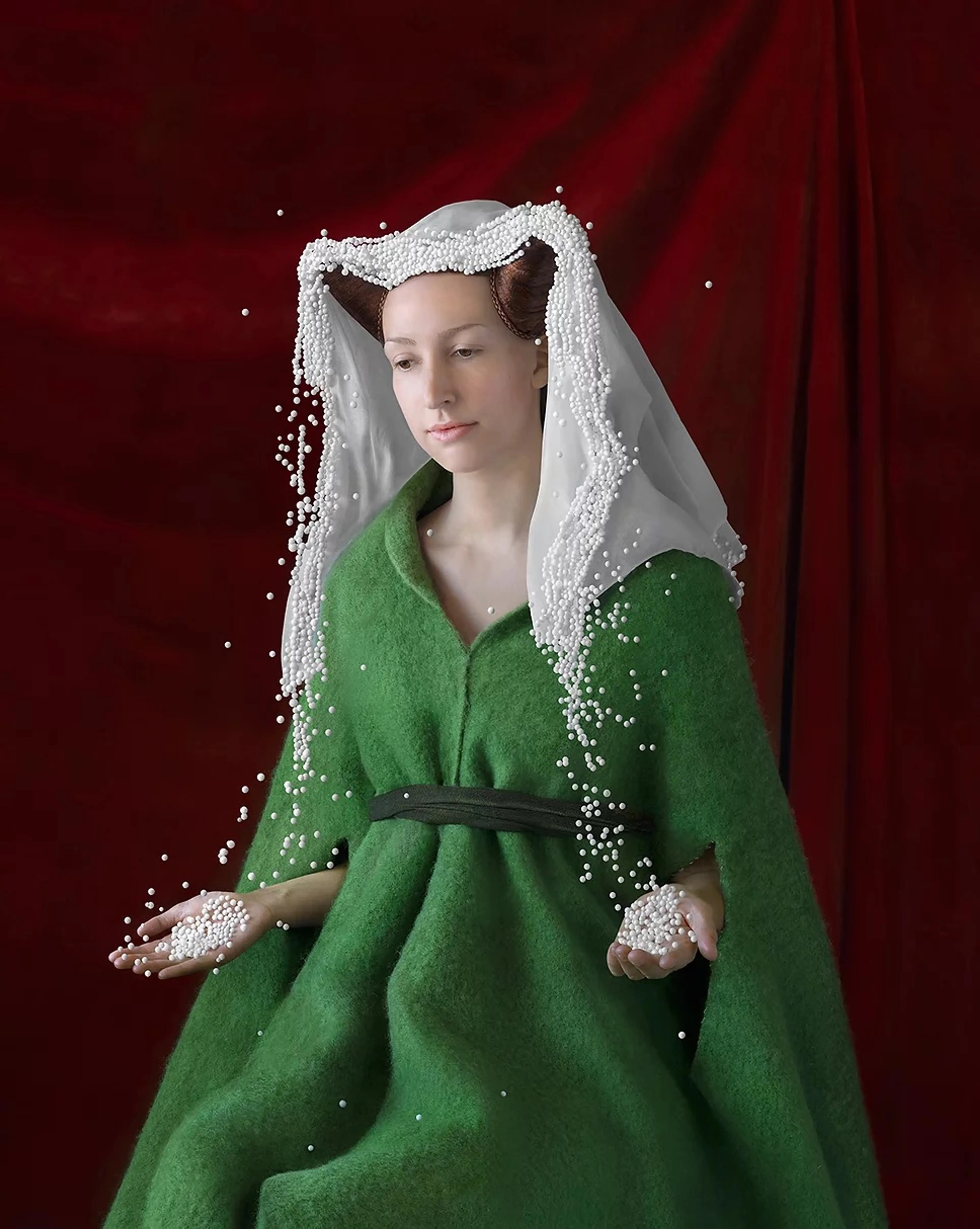 In het atelier van Suzanne Jongmans (coupeur, beeldhouwer, kostuumontwerper en fotograaf) in Breda hangen enkele grote afdrukken van haar werk: ingetogen portretten waar de inspiratie van de oude meesters vanaf spat. Boeken over die kunstenaars uit de 15e, 16e en 17e eeuw liggen op tafel. Aan wand hangen kleine schetsen en losse materialen: een hoofdkapje van inpakfolie. Het contrast in materiaalgebruik typeert Suzannes werk, zoals bloemen en wol, maar ook parels en piepschuim.