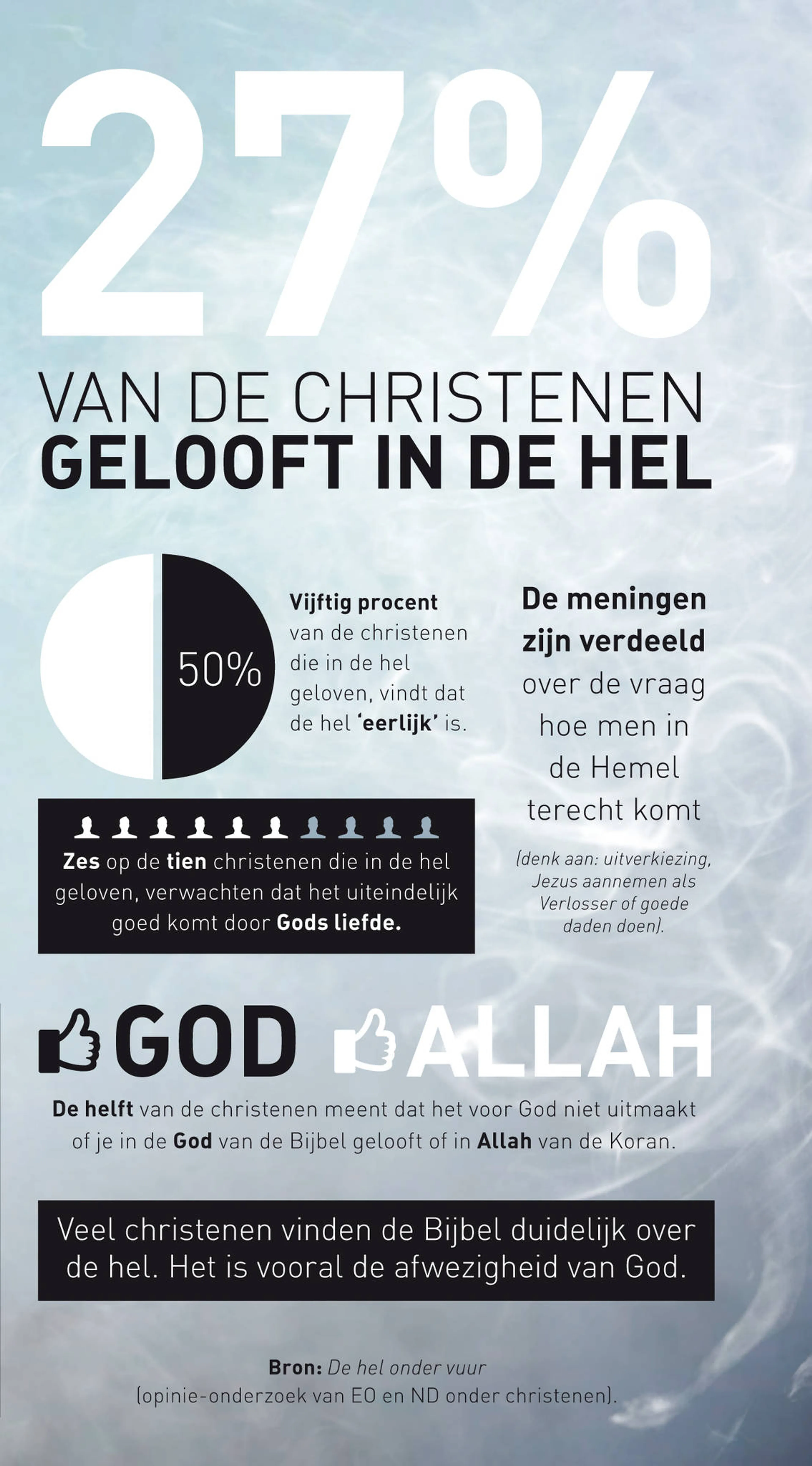 'De hel onder vuur' is de titel van het opinieonderzoek onder christenen in Nederland, in opdracht van de EO en het Nederlands Dagblad. En wat blijkt? Lang niet elke christen gelooft nog in het bestaan van de hel. Slechts 15% van de Rooms-Katholieken en 36% van de PKN-protestanten denkt nog dat de hel bestaat. Daarentegen is het geloof in een eeuwige hel onder evangelische christenen het hoogst: 83%. Ze worden direct gevolgd door de gereformeerden met 67%.
