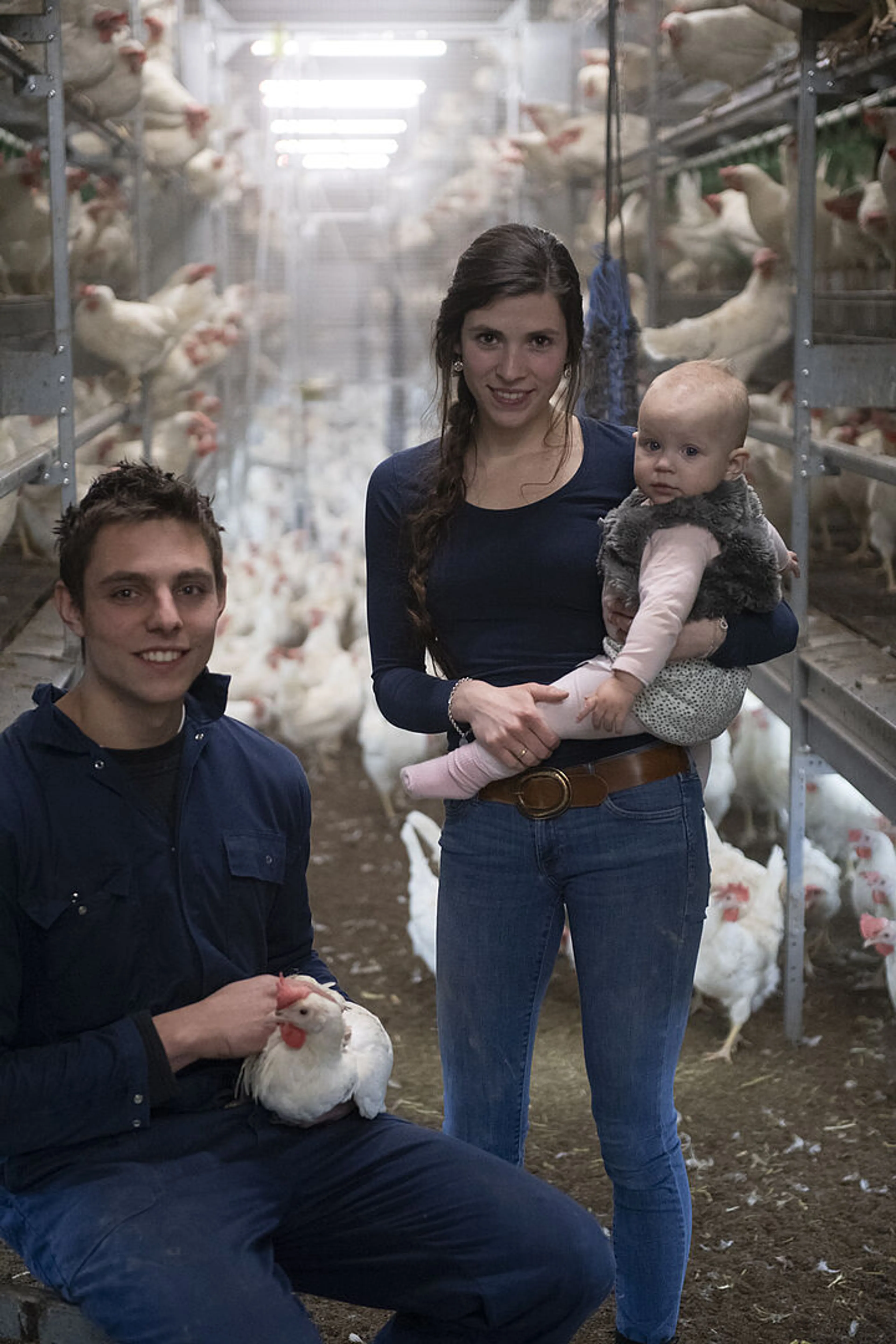 Tussen de bedrijven door maakt het stel tijd vrij voor de videoploeg van Visie. Ook zij krijgen een rondleiding door de stal, net als de fotograaf. Nauwkeurig vraagt Arnaud hoe ze over de pluimveehouderij denken. Met gepaste trots legt hij nog eens uit hoe in deze stal de fijnstofuitstoot tot tachtig en misschien wel tot negentig procent wordt verminderd. Een proef van de Wageningen Universiteit heeft hem de mogelijkheid gegeven om in plaats van negenduizend kippen het aantal te houden dat hij nu heeft. Er komen nog twee proefstallen in Nederland, om goed te kunnen vergelijken. “De eerste indruk is positief, maar er moeten nog metingen gedaan worden.”