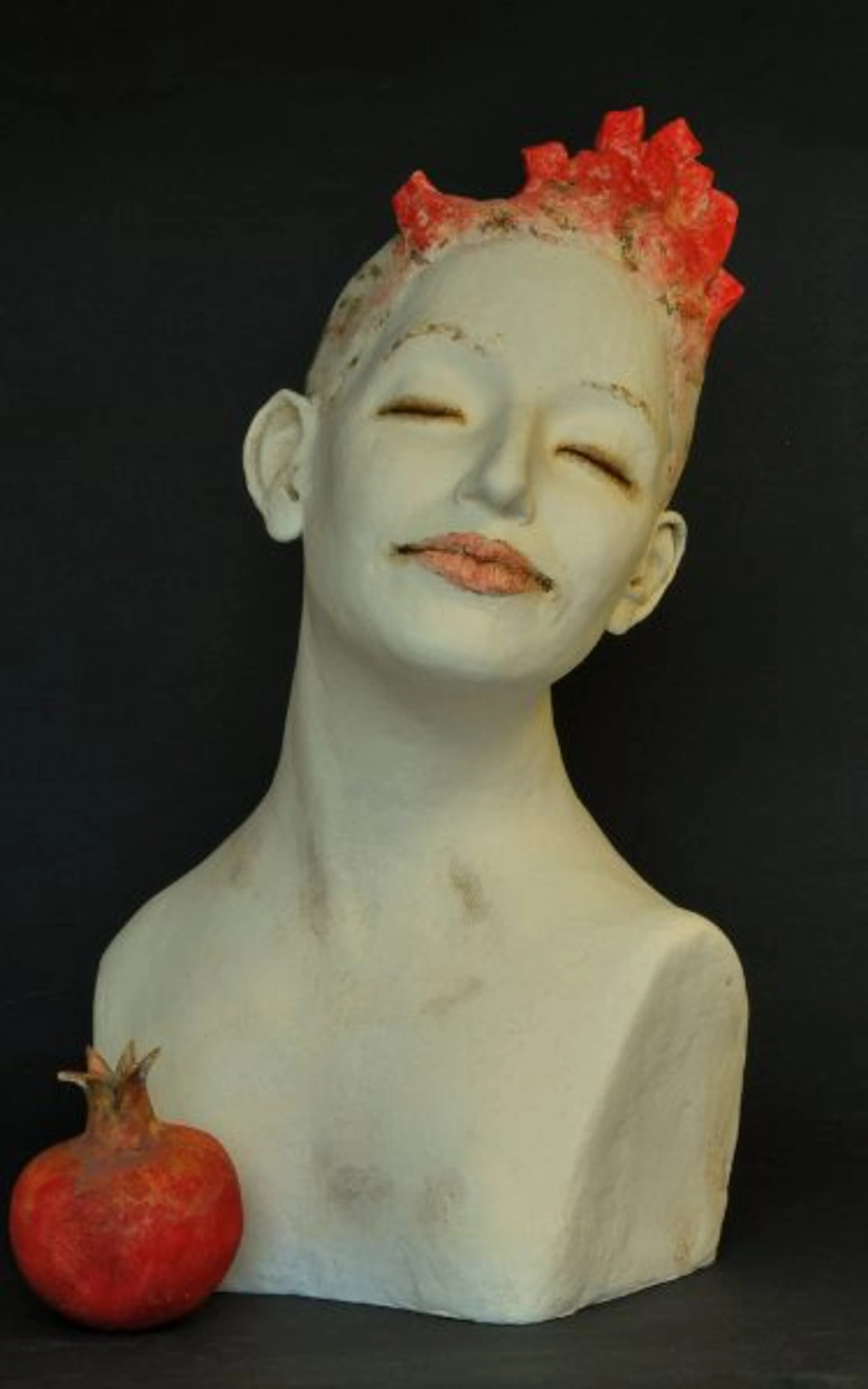 Er is een granaatappeltje bij geplaatst, ook van klei. In het Bijbelboek Hooglied wordt de bruid vergeleken met kleurrijke en heerlijk geurende vruchten, bloemen en kruiden, zij is ook omschreven als een vruchtbare tuin. De associatie met de Hof van Eden ligt ook niet ver. ‘Aan jou ontspruit een boomgaard vol granaatappels, met een overvloed aan vruchten…’ (Hooglied 4:13)