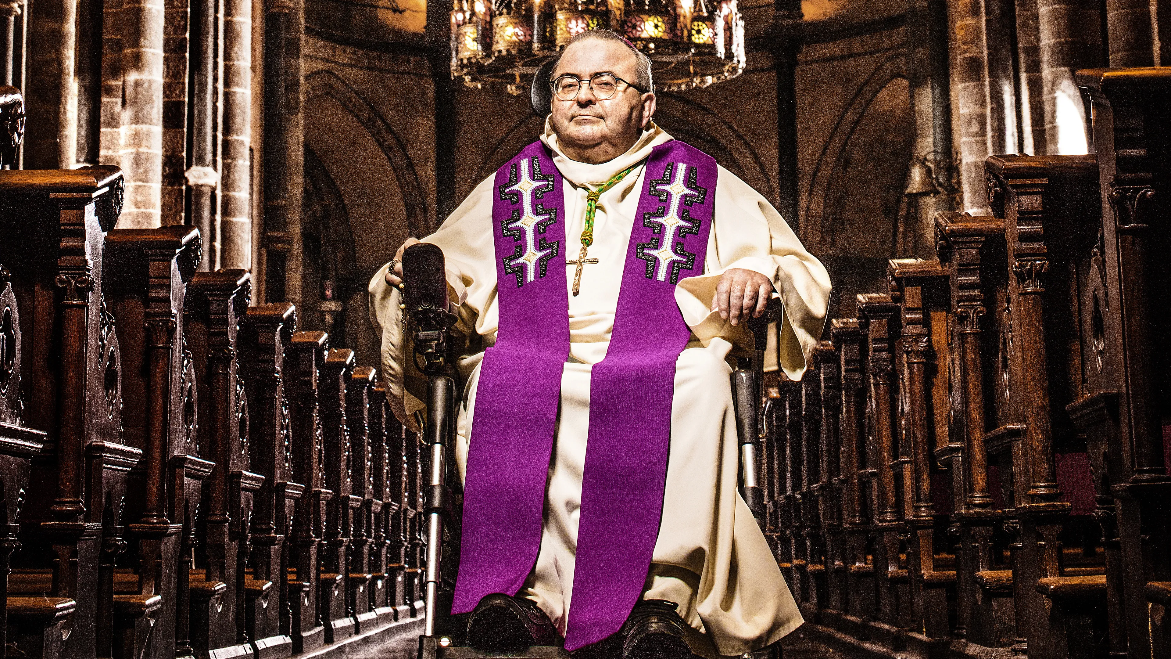 Het interview vindt plaats op een winterse donderdagochtend, begin maart. In zijn rolstoel zit de bisschop aan de lange houten vergadertafel in de bestuurskamer, genietend van een kopje koffie. Negen portretten van zijn meer recente voorgangers bedekken de hoge muren. “Zoals u ziet, is er voor mij geen plaats meer”, grapt hij.