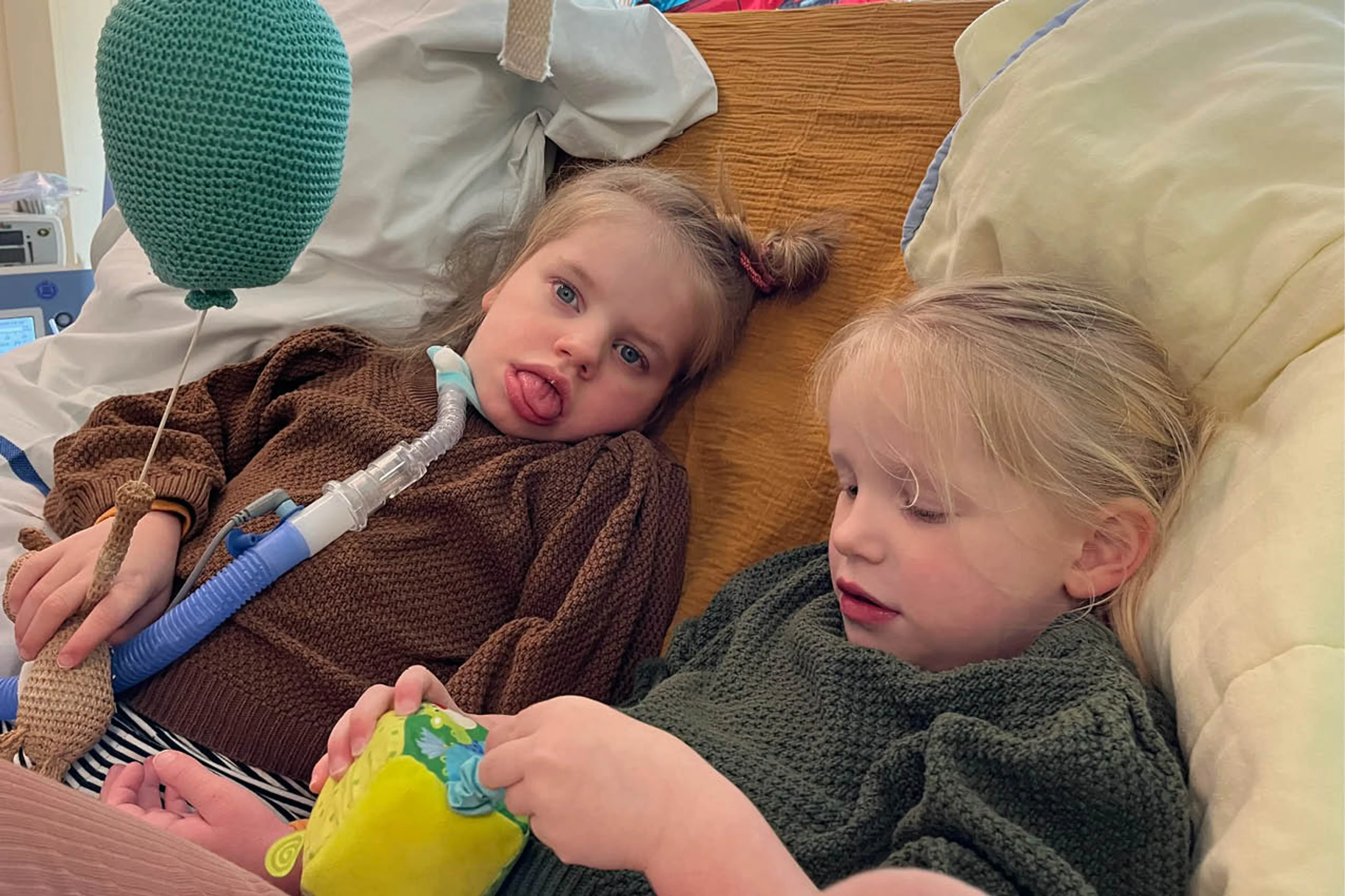 Sinds januari ligt haar dochter op de IC, met het vooruitzicht dat ze pas in juni weer naar huis mag. “Ze had dit keer een longontsteking door een heftige griep. Er is een canule ingebracht, een soort buis waardoor ze met beademing naar huis zou kunnen.” Ze ziet dat haar dochter ook nu weer opkrabbelt. “We zien dat ze opknapt, dat is heel fijn. Ze speelt regelmatig met het dopje van de canule. Ze heeft wel door dat als ze de slang lostrekt, er allerlei alarmen afgaan en dat de verpleegkundigen naar haar toekomen. Dat doet ze ook wel bewust, dat vind ik ergens ook wel weer grappig. Het is een van de weinige manieren waarop ze de regie kan pakken. De verpleegkundigen kunnen daar ook wel om lachen, en vinden haar innemend”, vertelt Nynke. “Soms gaan ze net even extra bij haar kijken.”