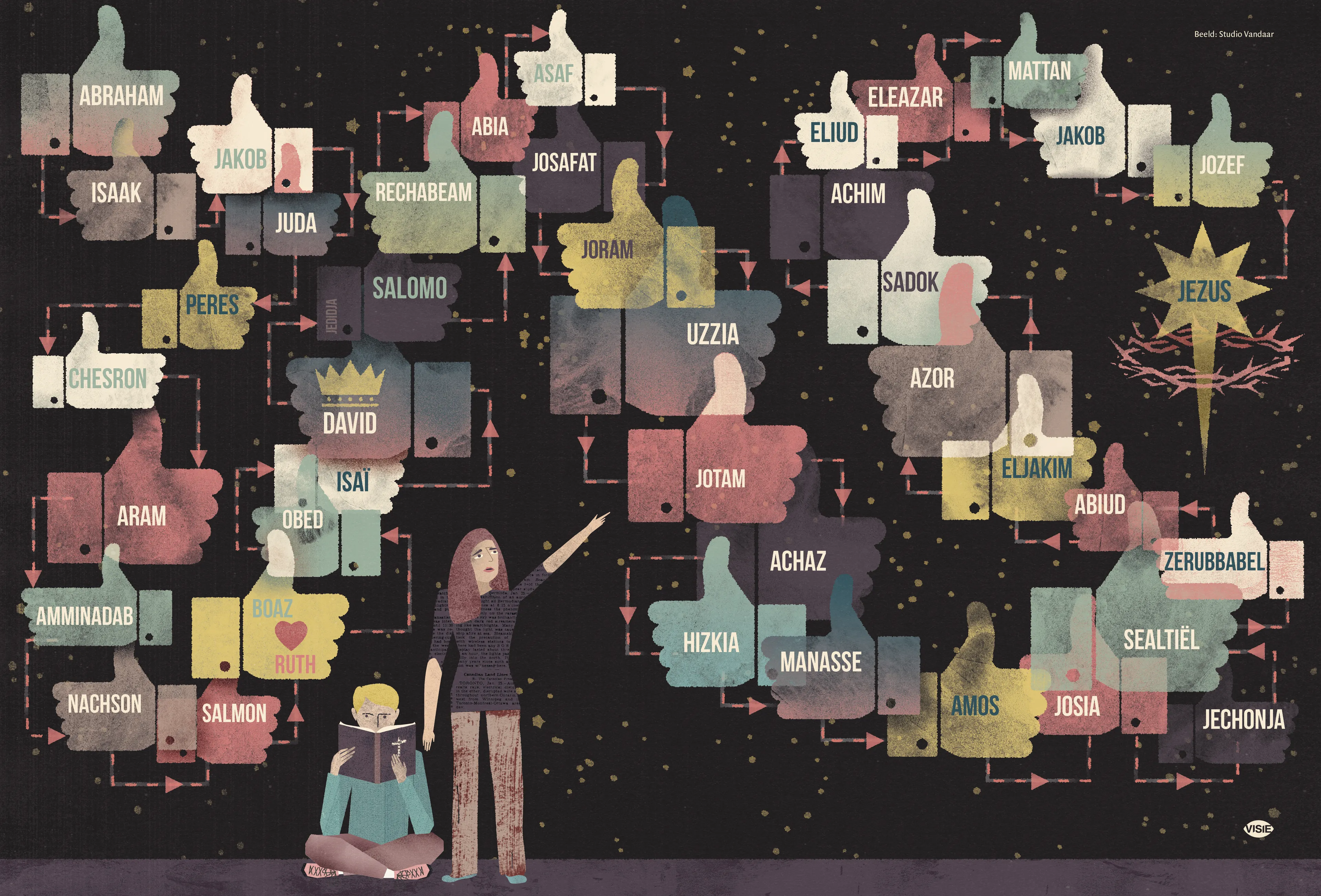 Geslachtsregisters in de Bijbel taaie kost? Welnee, niet als je er een stamboom van maakt. Visie vroeg Studio Vandaar een stamboom te maken van Jezus. Het resultaat is een prachtige ‘duimpjeshemel’, waarbij de namen in Facebookduimpjes als sterren aan de hemel staan. Het goede nieuws: je kunt de stamboom hier gratis downloaden.
