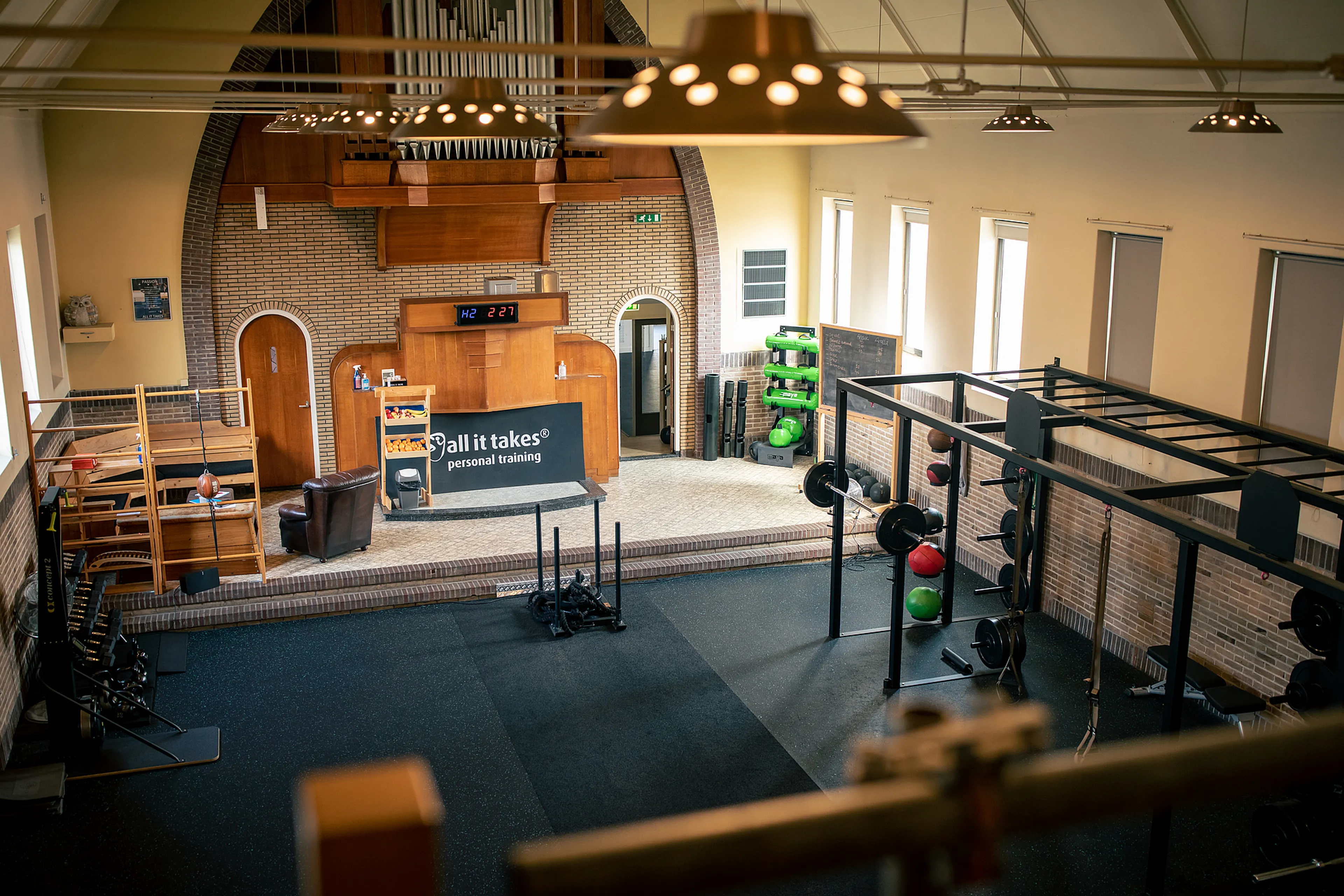 De eerste keer dat ik het gebouw bezocht – de voormalige baptistengemeente was daar toen nog gehuisvest – zag ik direct voor me wat ik met de ruimte wilde doen. Hier kon ik echt een mooie sportstudio van maken. Ook vond ik de positieve energie die in de kerk hing erg fijn. Aangezien wij geen normale fitnessclub zijn, maar met mensen aan zowel hun fysieke als hun mentale doelen werken, is dat erg belangrijk. Want als je je ergens thuis voelt en de sfeer is goed, kun je makkelijker jezelf zijn.