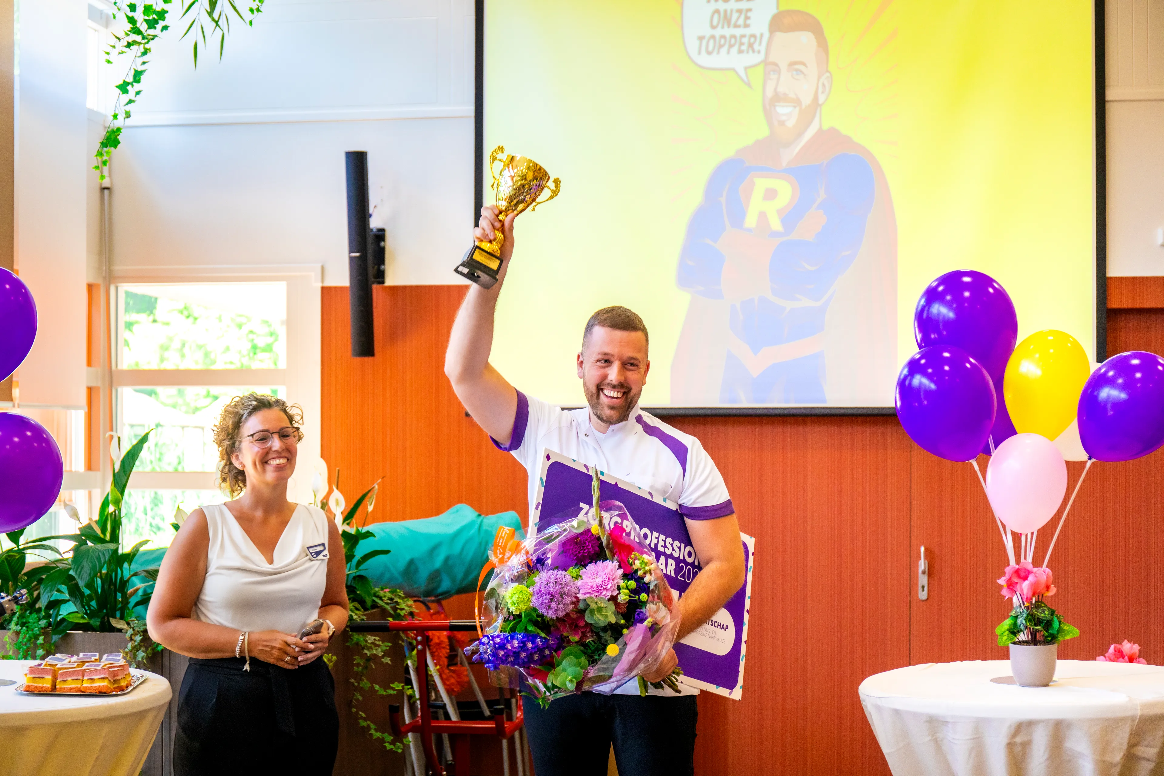 Het is feest bij zorginstelling Thebe in Breda: verpleegkundige Roel van Schilt (31) is uitgeroepen tot Zorgprofessional van het jaar. Roel werd vanmorgen rond de klok van 10.00 uur verrast door vrienden, collega’s én EO-presentator Gor Khatchikyan.