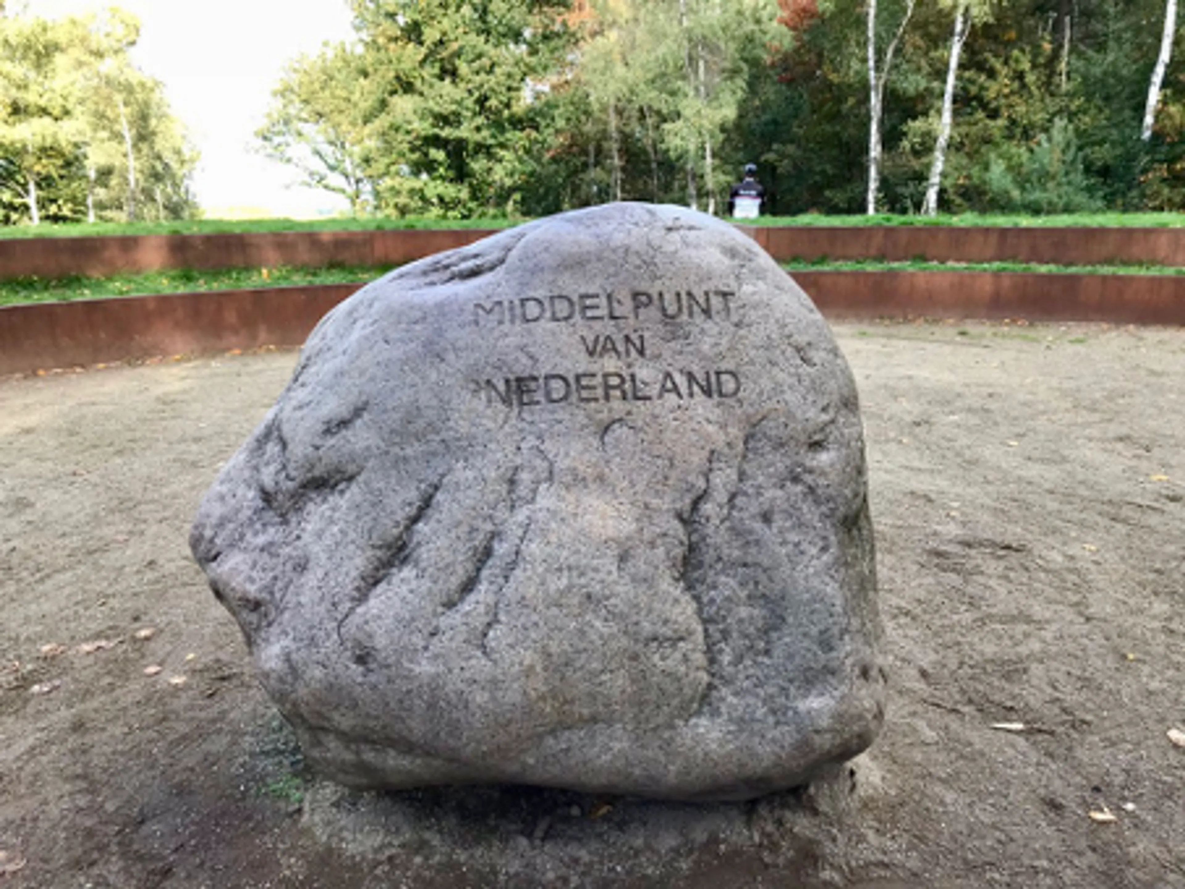 En ja, die ‘enorme kei’ ligt dus midden in het Lunterse Buurtbos. Met nog twee andere keien vormt het een driehoek en markeert het hét (geografische) middelpunt van Nederland. De ene zijde van de stenen driehoek wijst naar het noord-oosten, waar de zon op de langste dag opkomt en de andere zijde wijst naar het zuid-oosten, waar de zon op de kortste dag opkomt.
