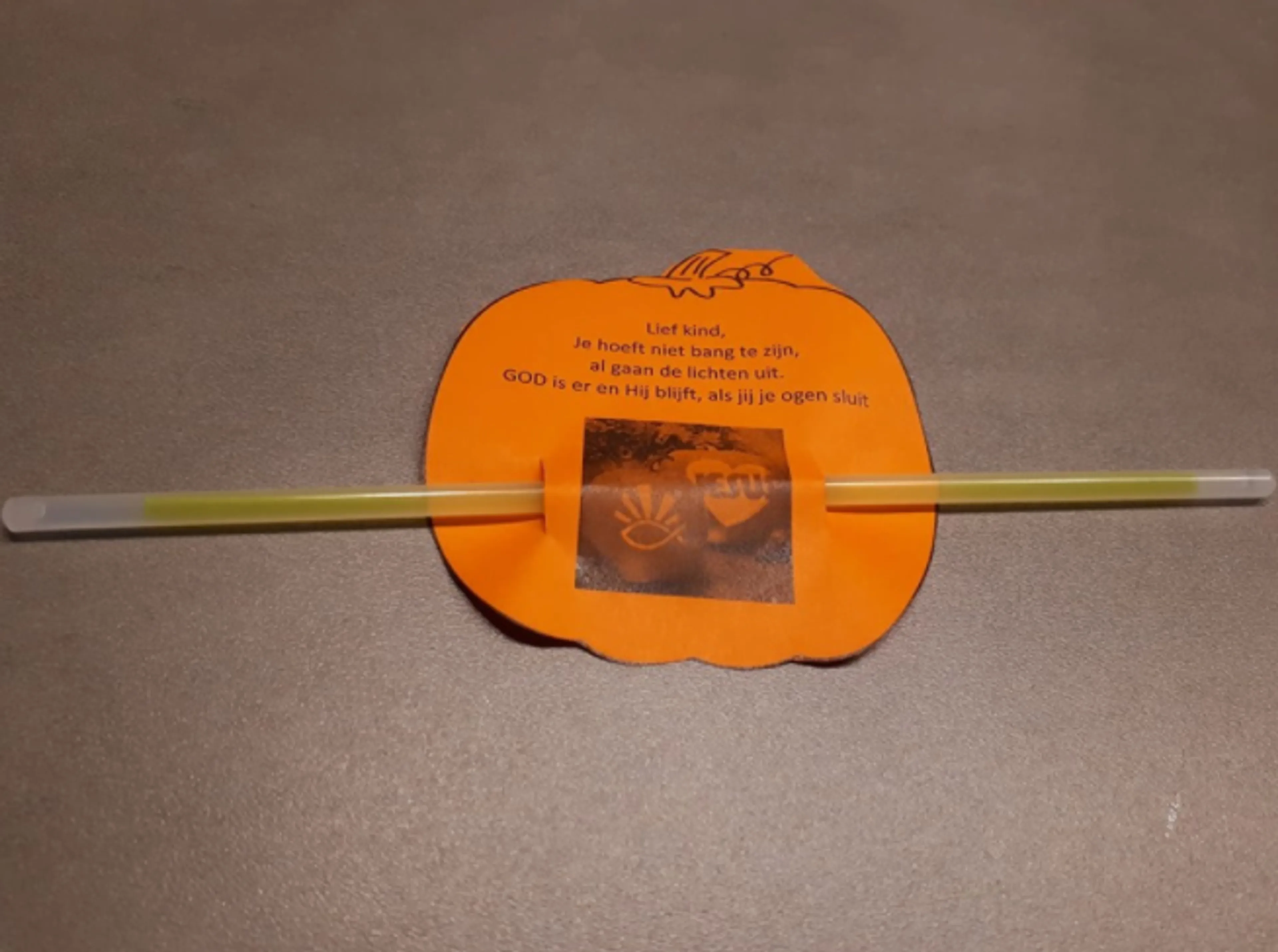 Tijdens de optocht gaan de mensen langs de huizen waar een pompoen voor staat en dan vragen ze een snoepje. Ik wilde het licht meegeven aan de kinderen en daarom ben ik begonnen met het geven van lichtstokjes, die je moet knakken om het licht te laten geven. Daar zit dan nog een kaartje aan met een versje: