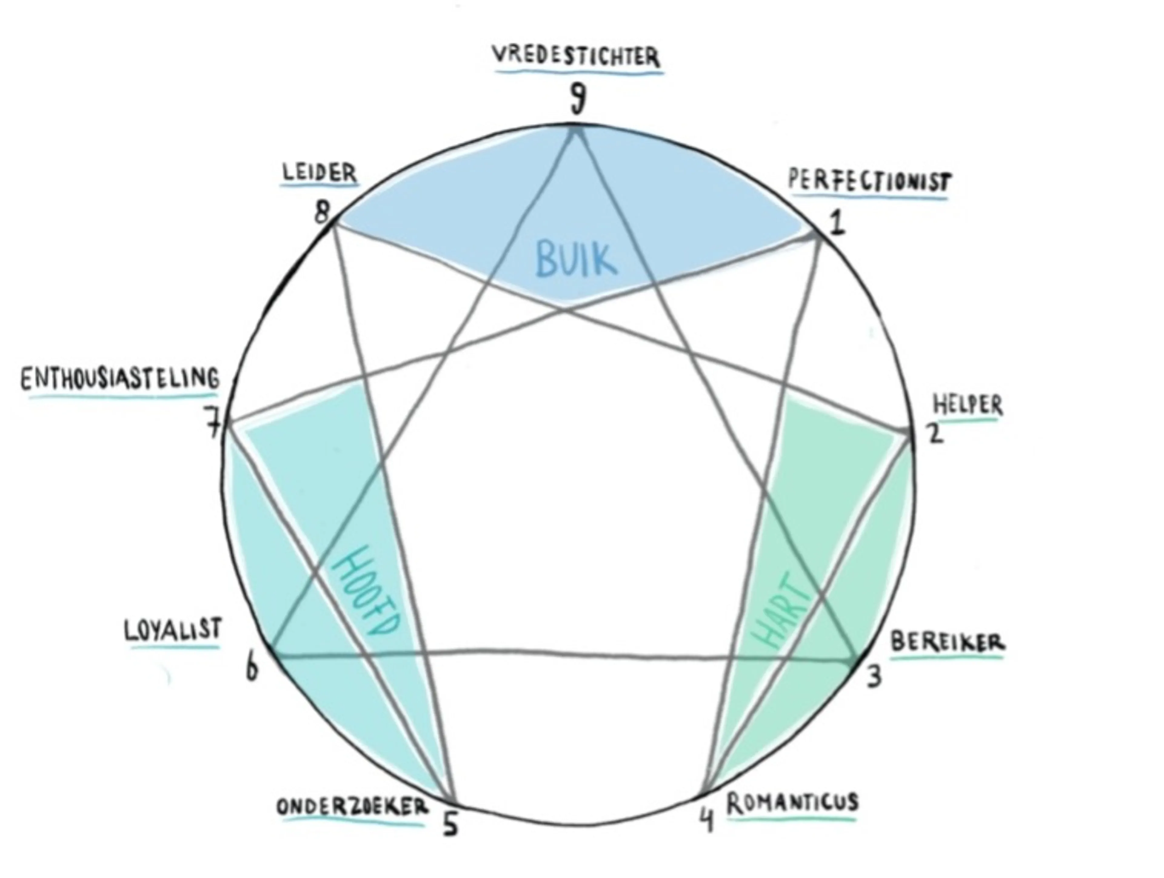 Aldus Floortje, mijn verloofde, en ervaringsdeskundige die veel van zichzelf herkent in Enneagramtype 9: de Vredestichter. Dit keer wil ik namelijk wat dieper ingaan op de (onder)buik-typen, dat zijn Enneagramtypes 1, 8 en 9. Deze typen horen bij het Buikcentrum, waarin ‘doen’ een belangrijke rol speelt.