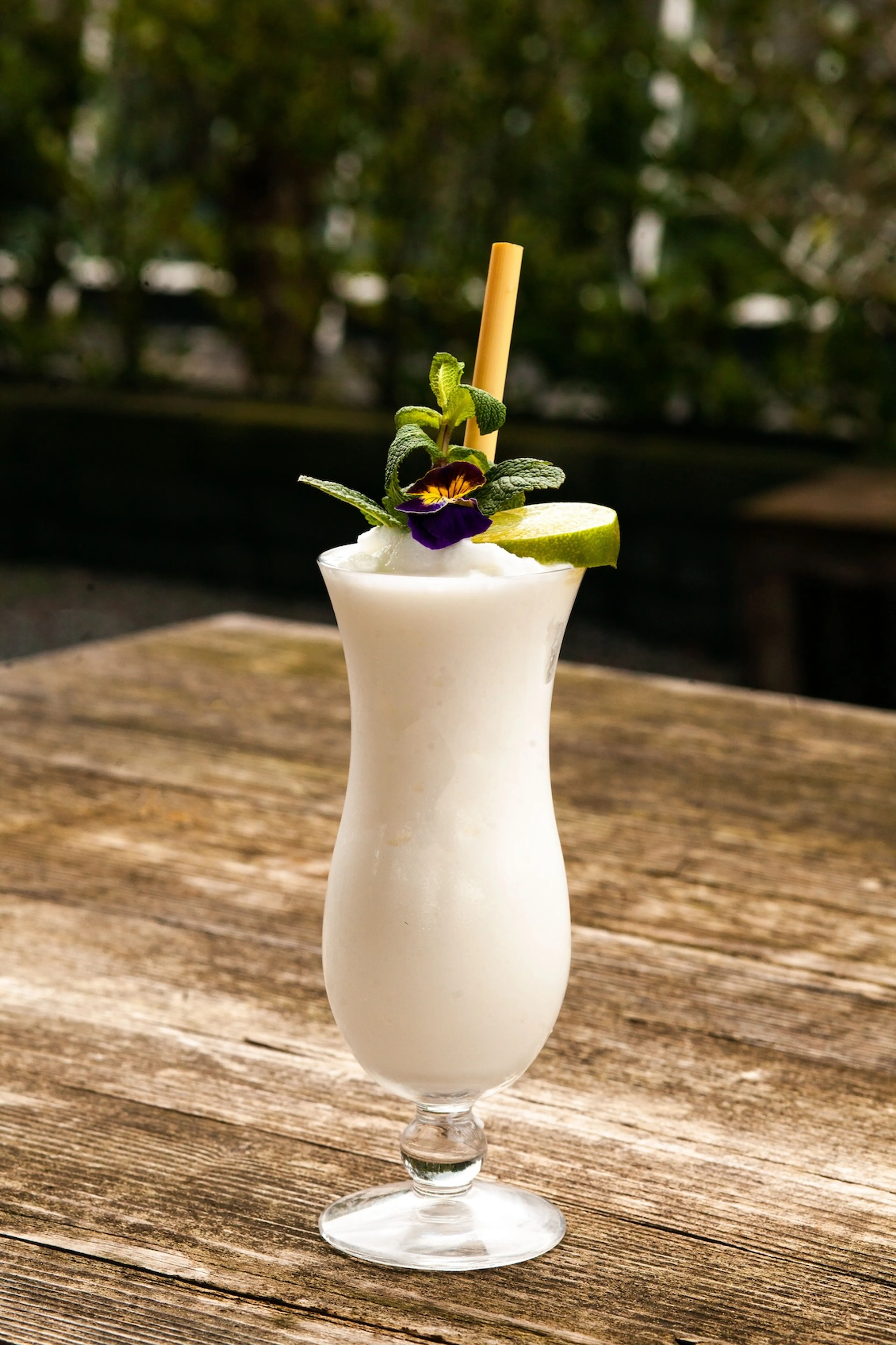 - Garneer de mocktail met het takje munt en een schijfje limoen, en leg de eetbare bloem op het takje munt.