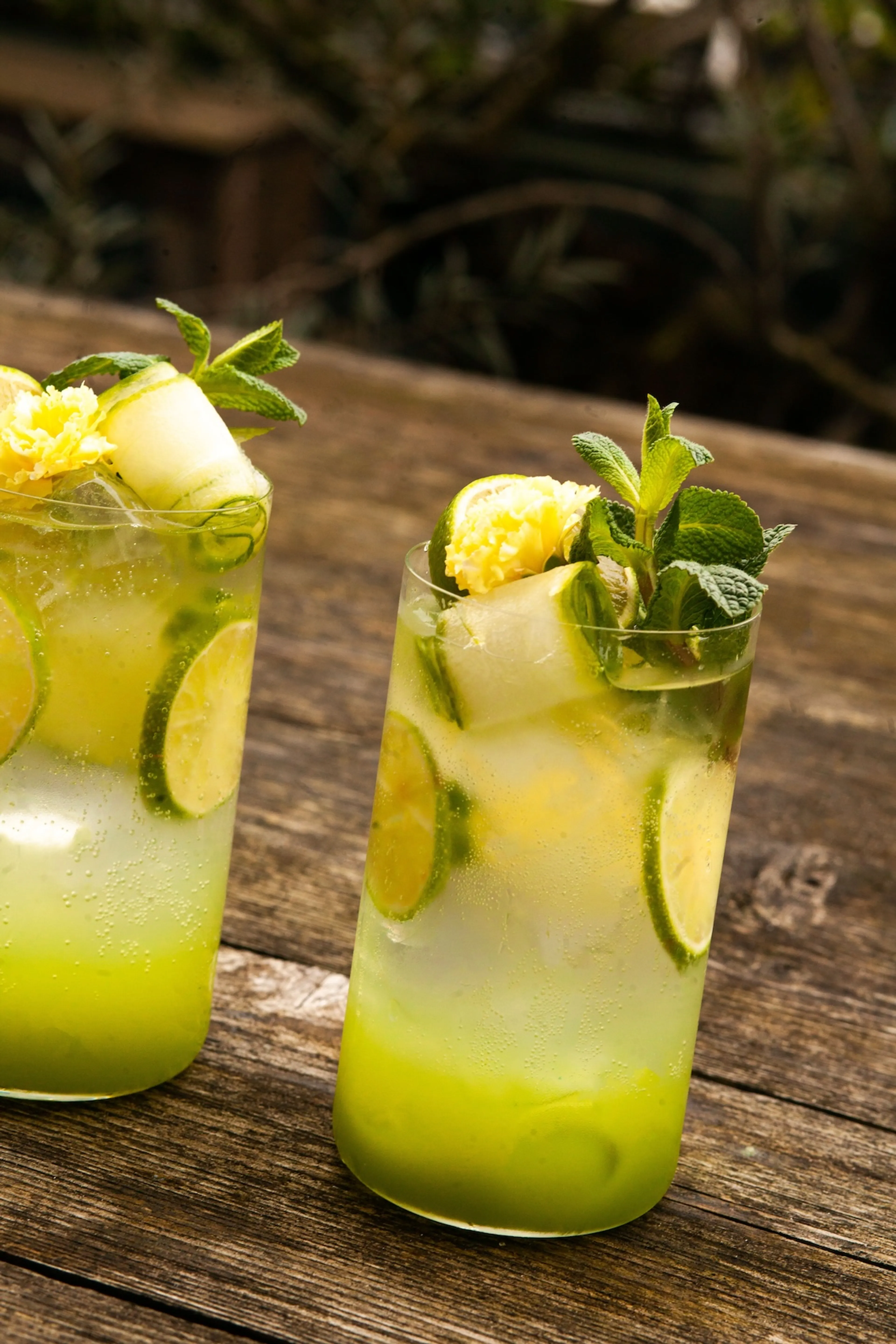 - Snijd voor de garnering drie dunne schijfjes van de komkommer en ook van de limoen. Doe de schijfjes komkommer en limoen in het glas. Roer door met de cocktaillepel.