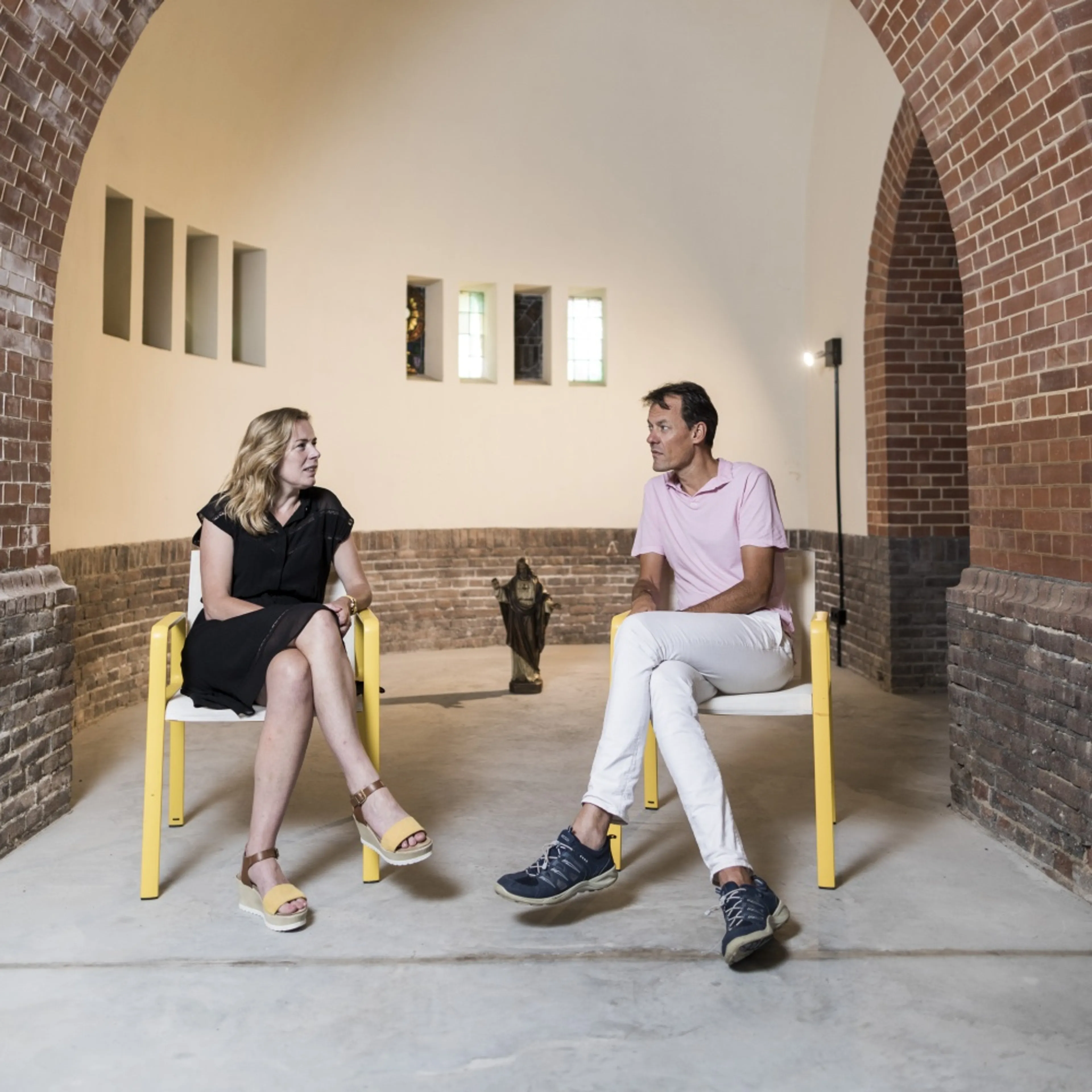 We zitten in de Hilversumse Clemenskerk op het balkon waar ooit het orgel stond. Het zonlicht door de kleurige ramen speelt zijn eigen spel.