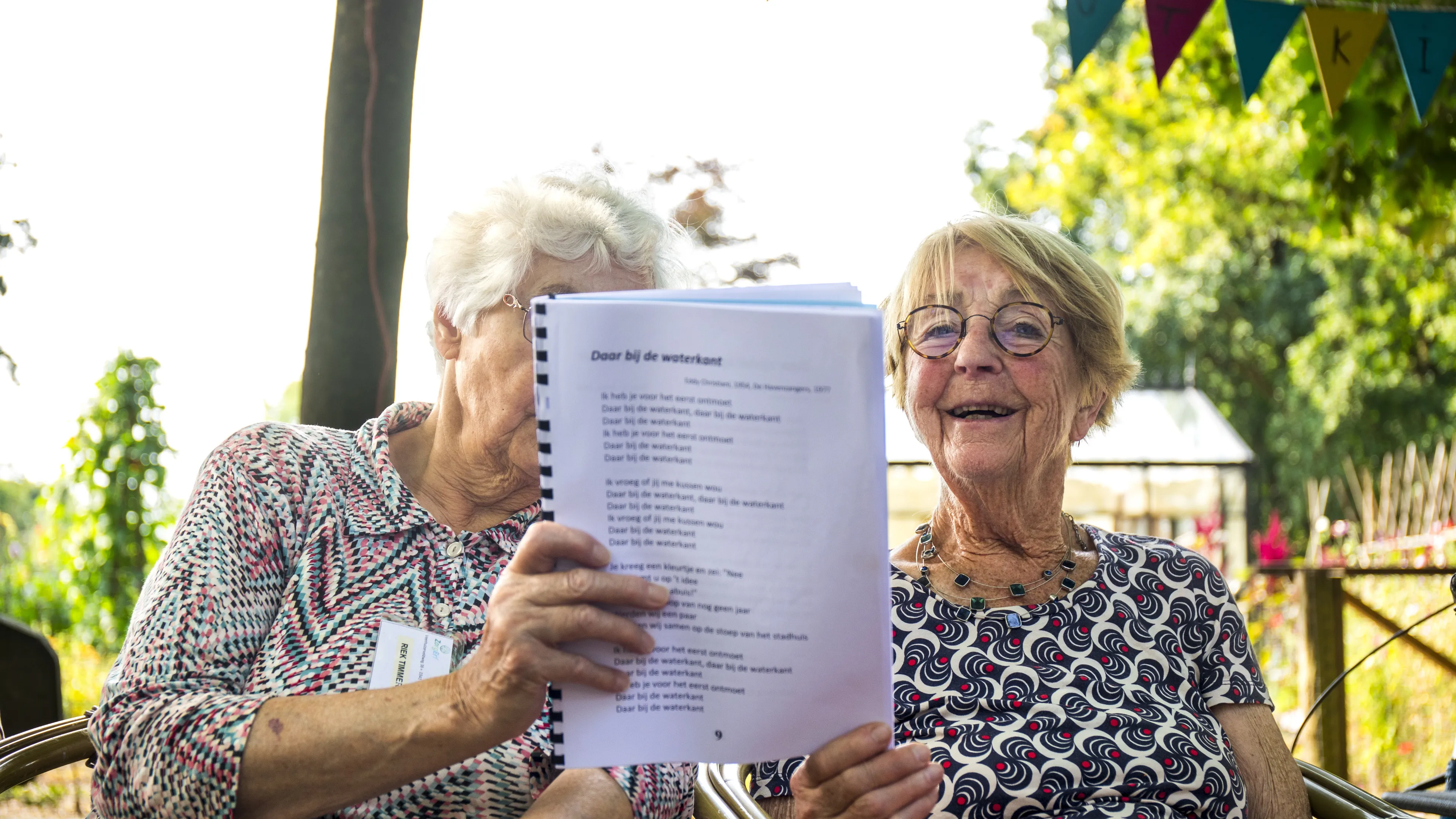 Een kleine, gebogen man met een geruite pet danst, gearmd met een vrijwilliger, feilloos op de maat van de muziek. Anderen klappen en zingen enthousiast mee. Op deze warme dag waait er een aangenaam briesje onder de hoge bomen. Zo’n vijftig ouderen met dementie hebben zich hier, in de verkoelende schaduw, verzameld voor de wekelijkse zangworkshop. De liedjes van vroeger roepen zichtbaar herkenning op.