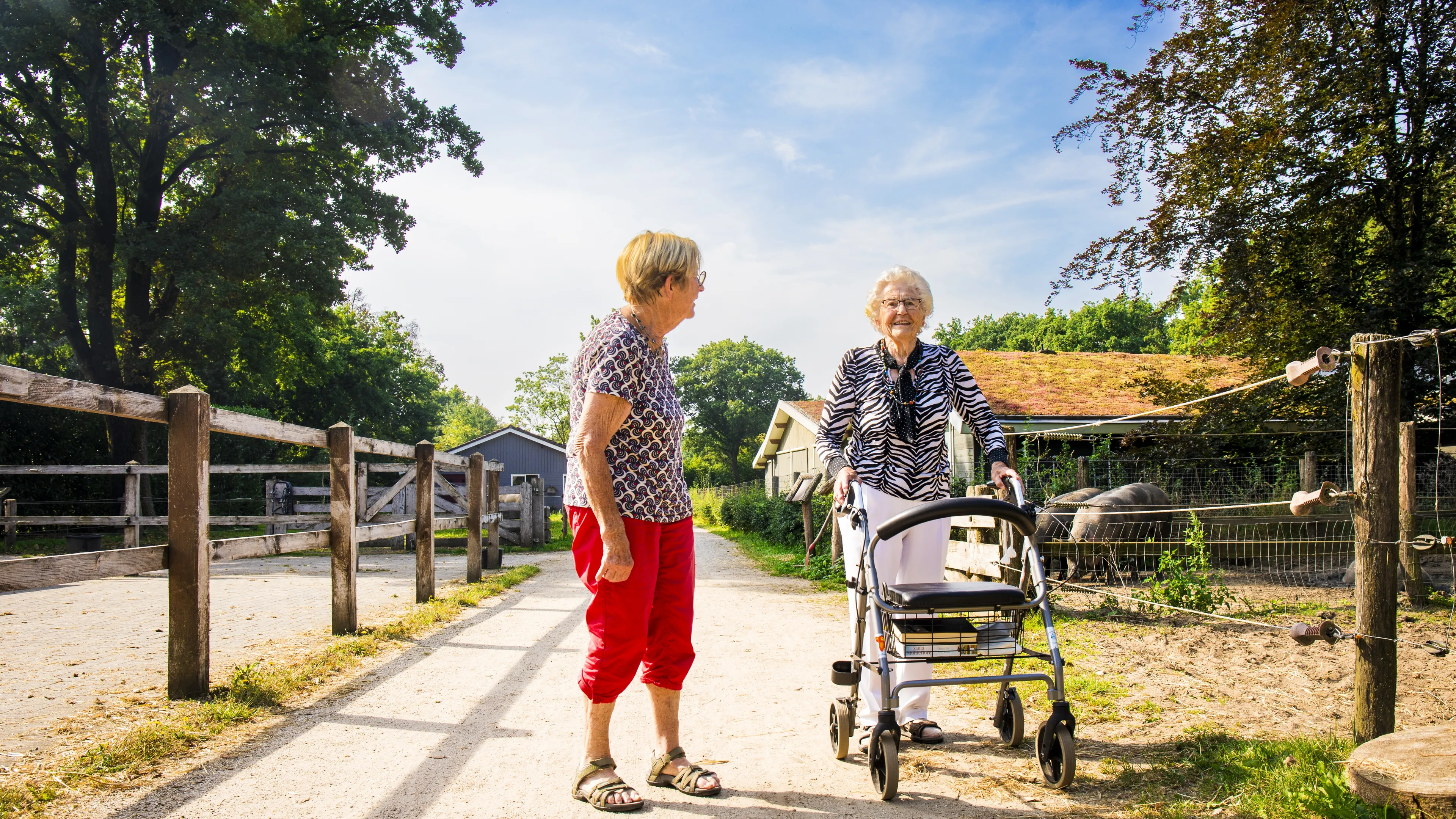 Bij ZorgErf wonen mensen met een indicatie vanaf zorgzwaartepakket 5. Dan heb je een ernstige mate van dementie, en in zwaardere situaties ook lichamelijke klachten en gedragsproblemen. Ze wonen in hofjes, die bestaan uit een gemeenschappelijk huis en een aantal kleinere huisjes, waar de bewoners hun eigen kamer hebben. In de parkachtige omgeving, met veel bomen, dieren en wandelpaden, kunnen de mensen veilig rondlopen. Ergens kraait een haan, vlak bij de vijver zit even na negenen de eerste bewoonster al buiten. Een medewerkster vraagt haar: “Wat wil je drinken? Thee, koffie, bier?”