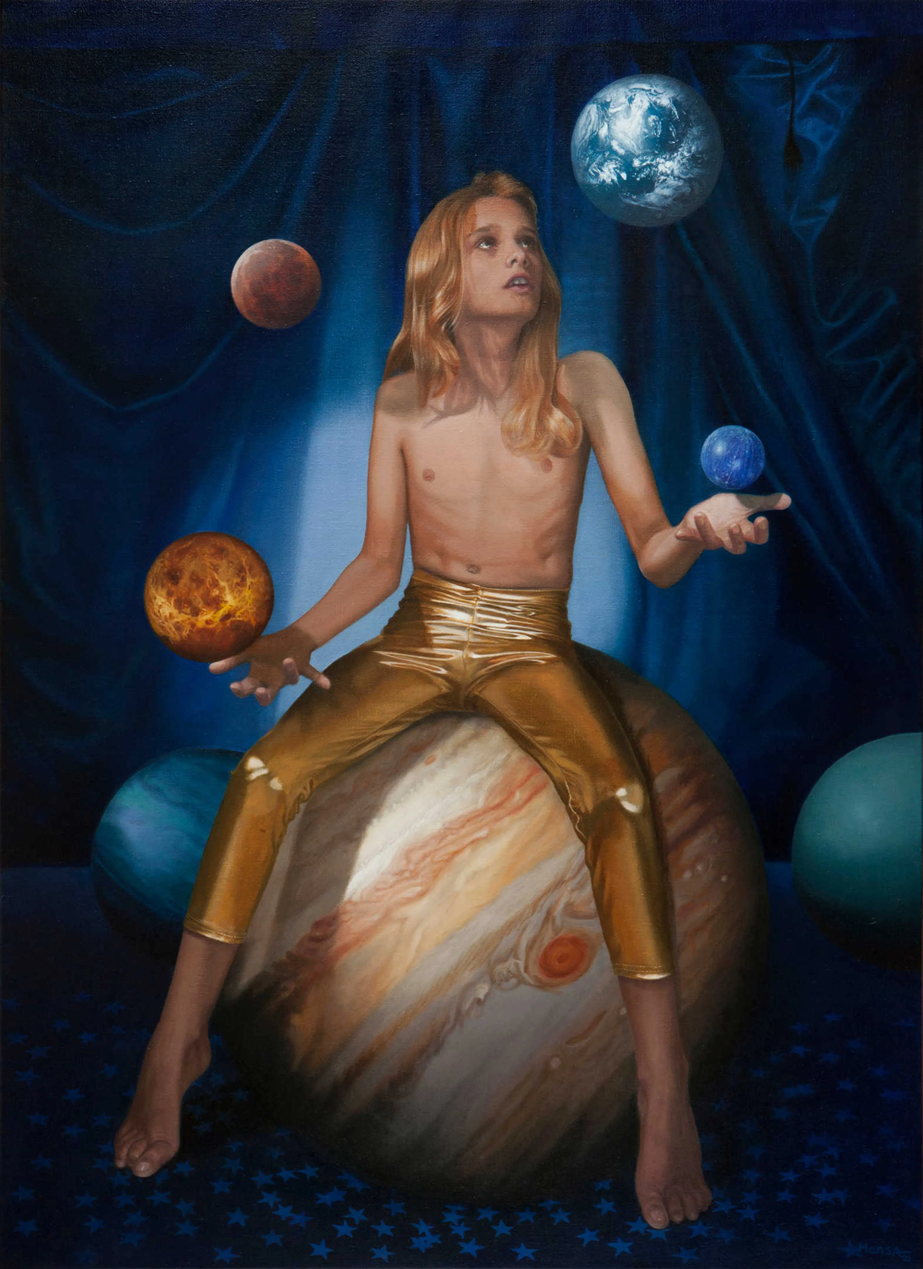 De schijnwerpers zijn op het lijfje van een jonge goochelaar gericht. Er slingert een vergeten stekker ergens in de gordijnen van een circuspodium. De gladde vloer is vol met plastic glow-in-the-dark sterretjes om het thema van de show te ondersteunen. Maar op het toneel van deze sjofele kermis zijn de planeten van ons zorgvuldig gecoördineerde, magische zonnestelsel herkenbaar als speelballen. De tovenaarsleerling zit – als een soort godheid – op Jupiter, de grootste planeet, en jongleert met andere planeten. Zijn aandacht is gevestigd op aarde.