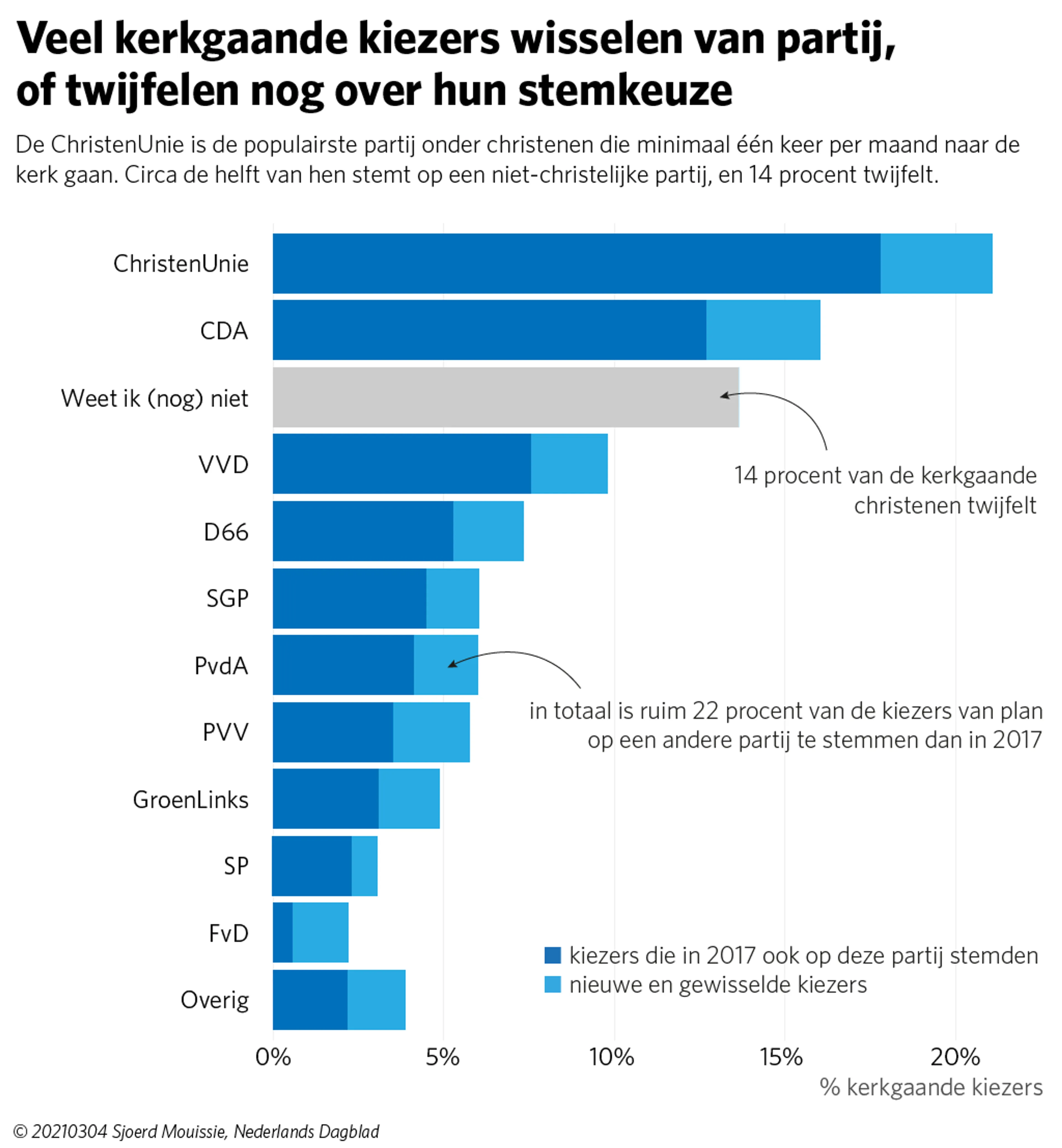 De helft van de kerkgaande christenen in Nederland stemt bij de komende Tweede Kamerverkiezingen op een seculiere politieke partij. Dat blijkt uit onderzoek van DirectResearch in opdracht van het NPO Radio 1-programma Dit is de Dag (EO) en het Nederlands Dagblad.