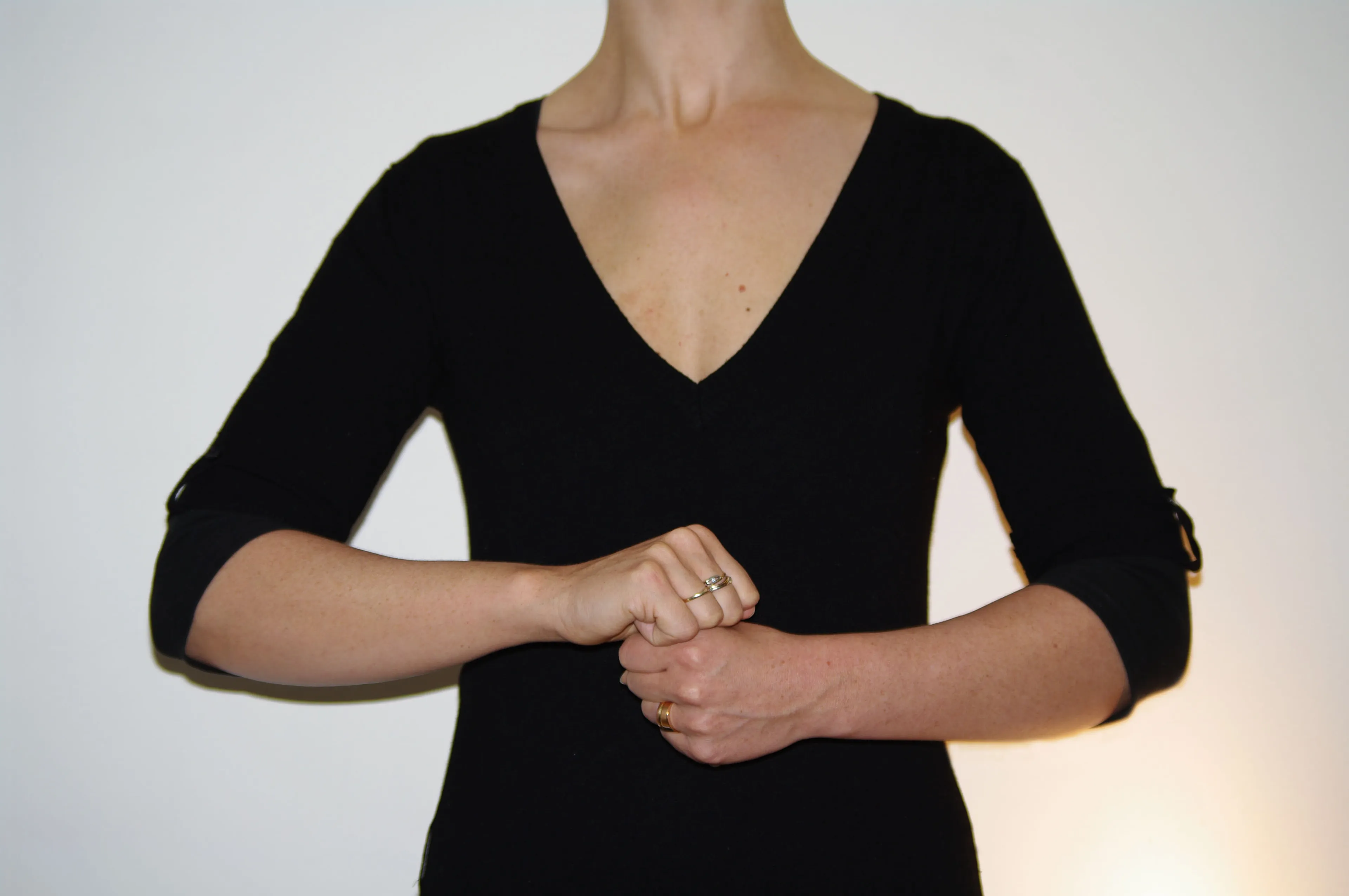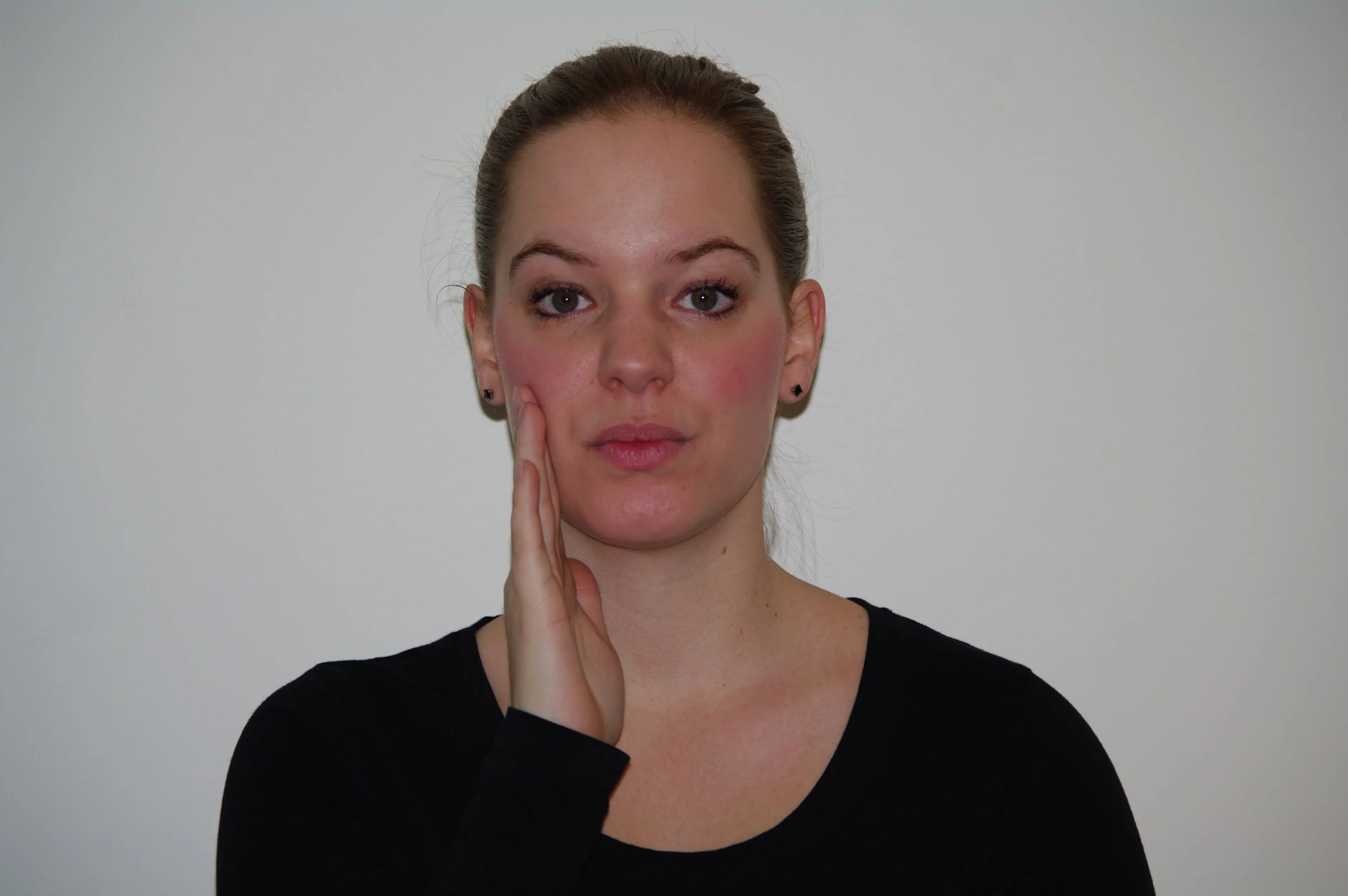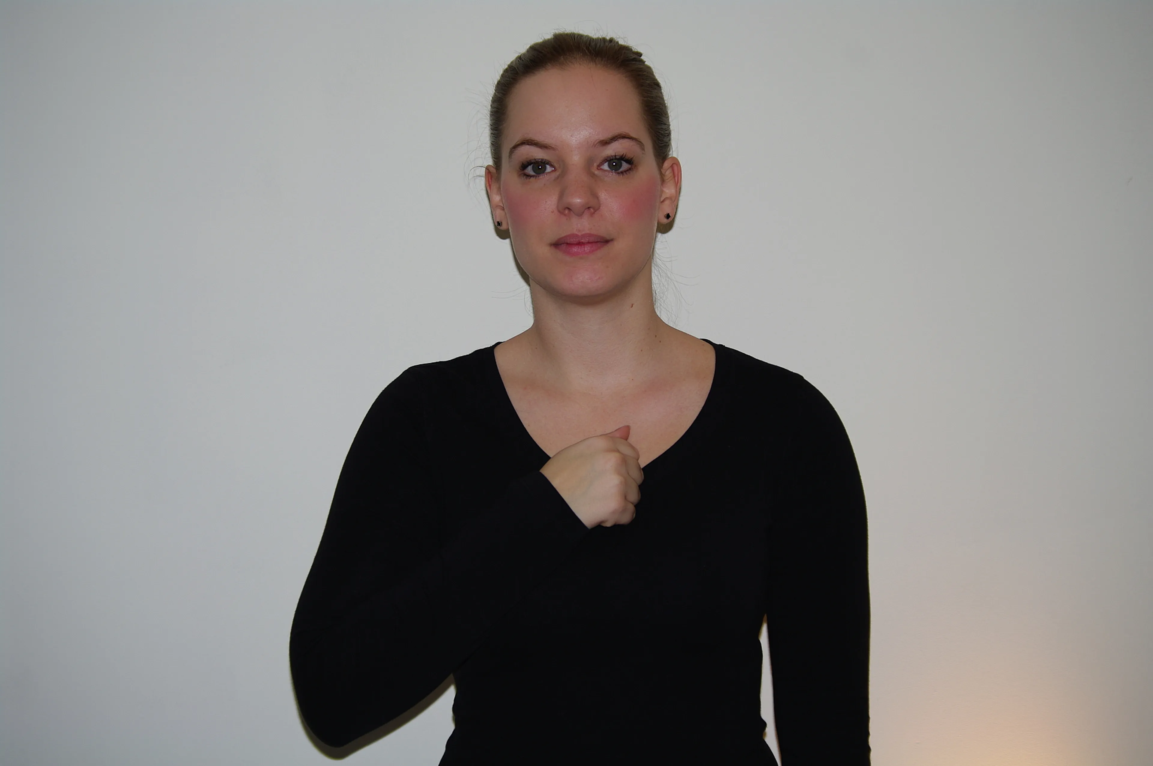 Leg je vuist op je hart, handpalm naar je toe, en maak een ronddraaiende beweging. De vuist blijft tegen de borst liggen terwijl je dit doet. Kijk berouwvol.