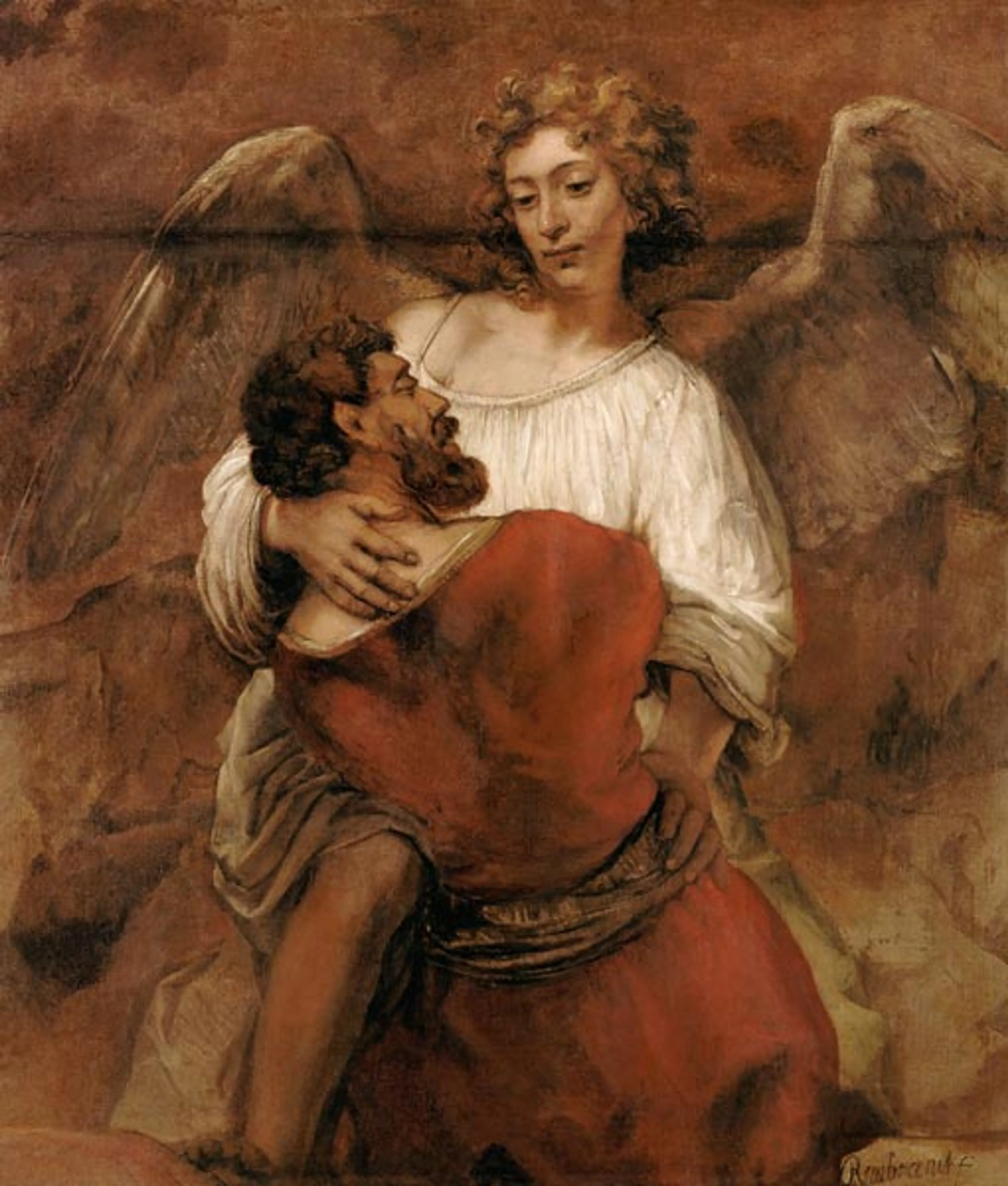 Een omhelzing? Ik twijfelde uiteraard aan deze interpretatie. Maar er zijn inderdaad goede argumenten om te geloven dat Rembrandt meer in beeld heeft willen brengen dan een worsteling. Wetenschappers hebben met behulp van speciale fototechnieken kunnen aantonen dat Rembrand de positie van de hand van de engel heeft verplaatst tijdens het schilderproces. De kunstenaar positioneerde de hand eerst op de hoogte van Jakobs schouder, maar door de hand naar boven te verschuiven transformeerde hij de worsteling in een zegening of omhelzing.