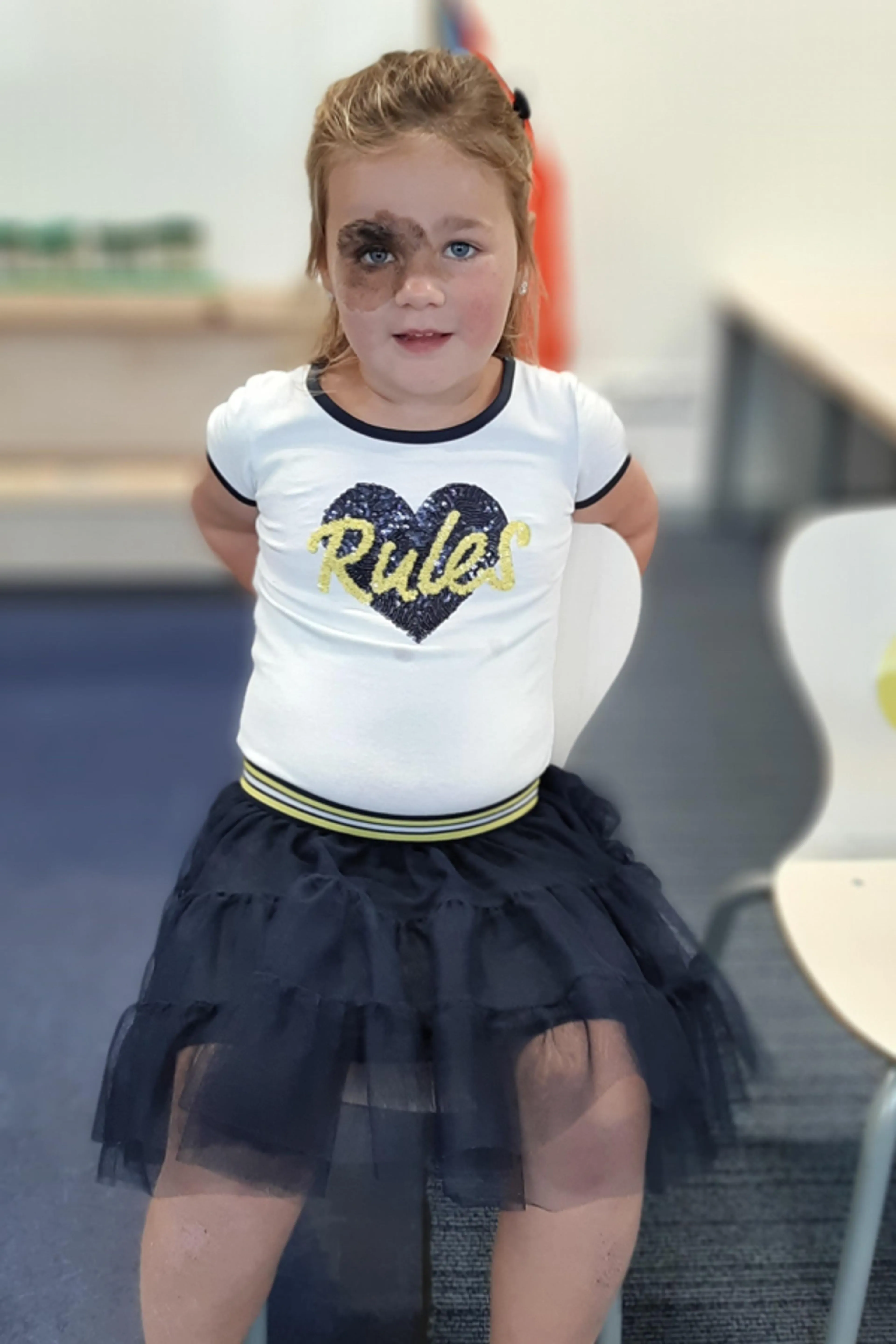 “Naomi is een pittige meid. Heel lief en zorgzaam en ze krijgt nu ook vriendinnen op school. Dat komt wel goed, ze is een doorzetter. Ik heb het er wel over gehad met de juf en uitgelegd wat het is. Ik vroeg aan haar of ze het wilde vertellen als andere kindjes erover gingen praten of haar pesten, dan kon ik het er met haar over hebben. Maar de kindjes om haar heen, ze hebben het eigenlijk niet in de gaten. Oudere kindjes staren nog weleens, maar in de klas accepteren ze het makkelijk.”