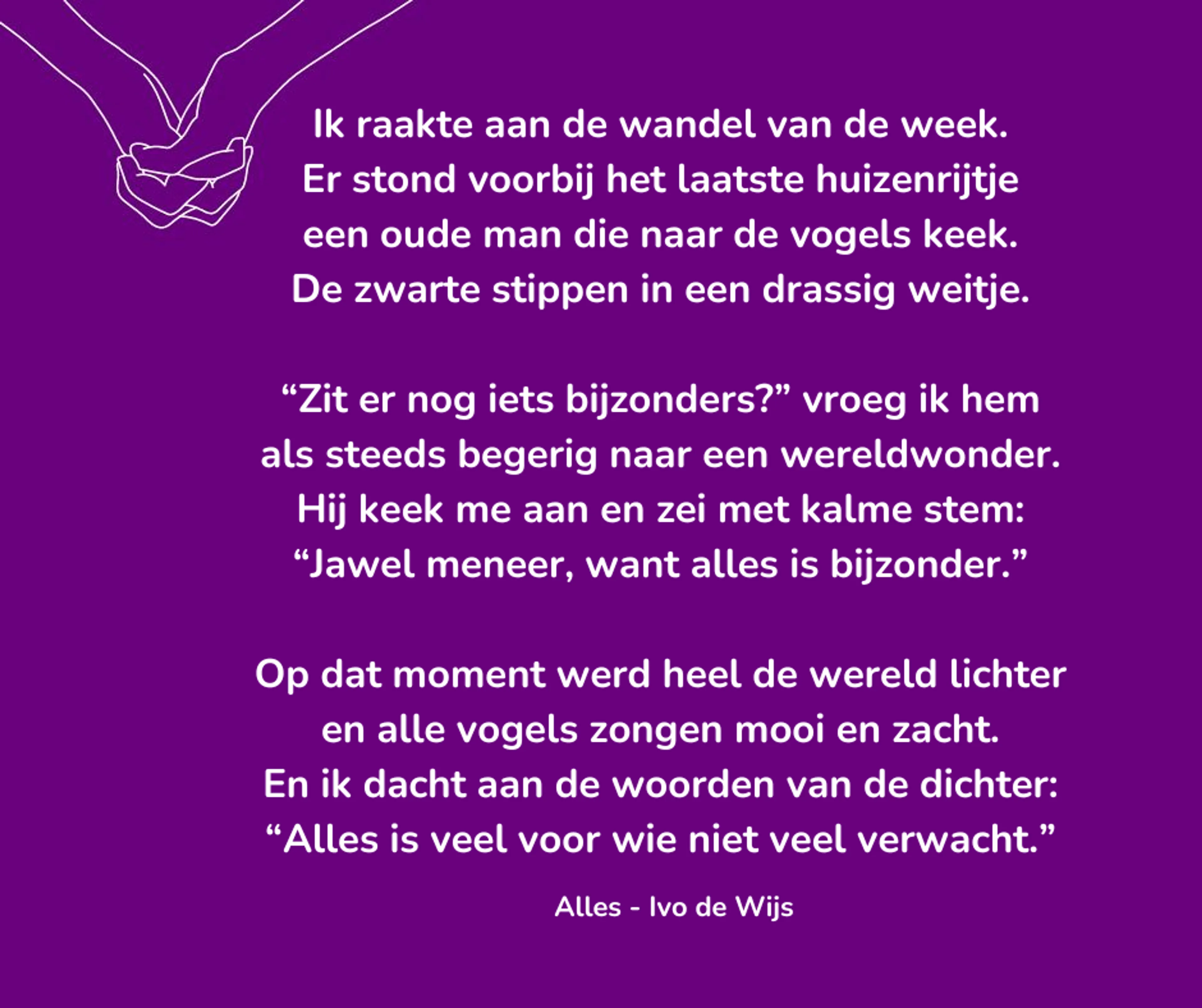 “Alles is bijzonder, klinkt er in dit gedicht. Het risico ligt op de loer dat je depressief wordt als je het verdriet op de wereld ziet. Dat je denkt: ik wil helemaal niet in deze wereld zijn, laat het maar aan mij voorbijgaan. Maar dat er toch altijd licht is en altijd hoop en dat er altijd vogels blijven fluiten, wat er ook gebeurt – dat is voor mij wat er in dit gedicht zit. En de beweging van de grote dingen naar de kleine dingen. Met het ouder worden komt het besef dat het daarom draait.”