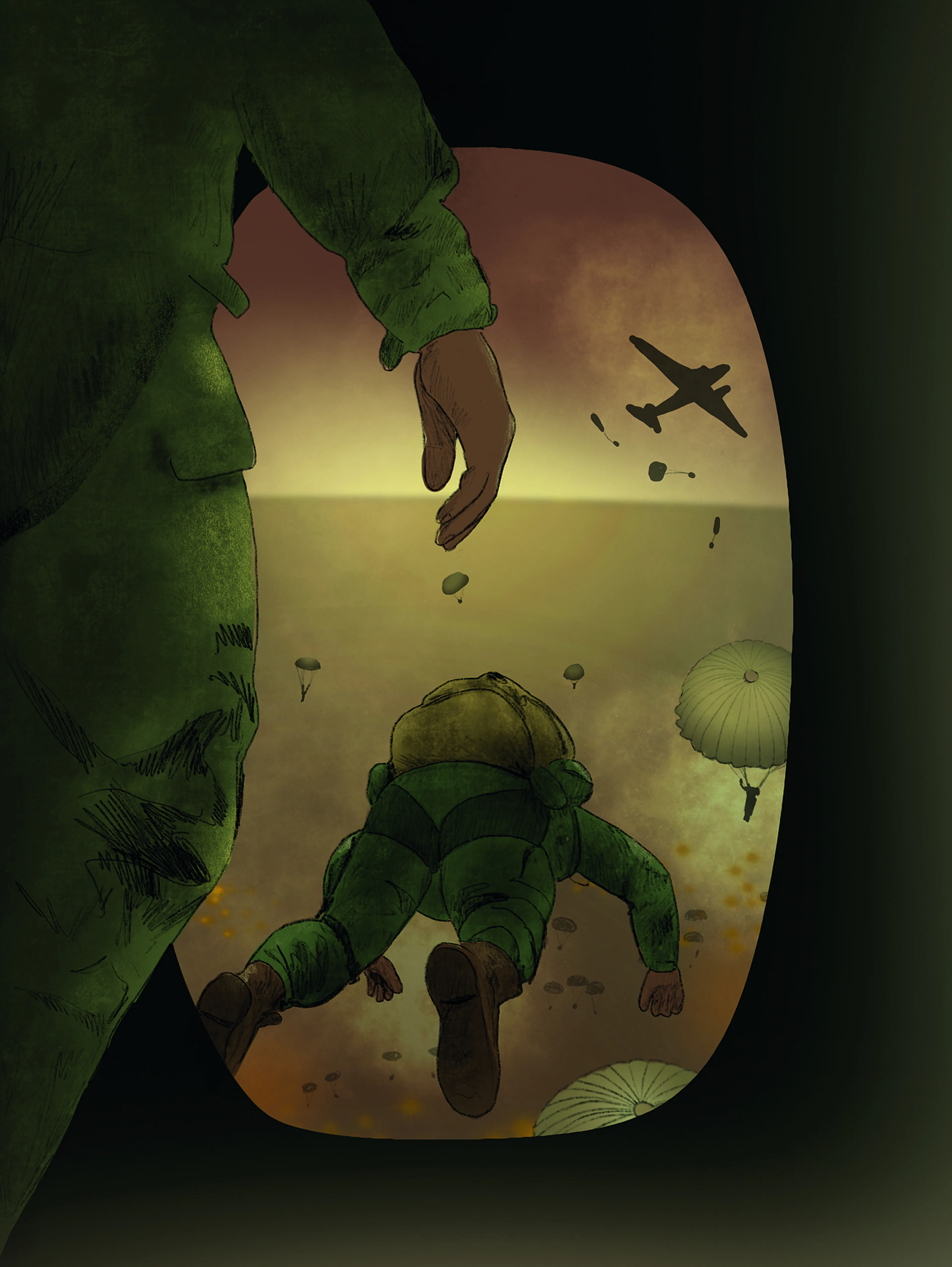 We gaan bijna springen. Ik zit in een van de dertig Dakota-vliegtuigen die deze missie uitvoeren. Met een haakje zit ik vastgeklikt aan een lange kabel. Als we eenmaal mogen, glijd ik zo van de kabel door het luik naar buiten. Voor me zie ik Tom en Robert staan. Het is donker, verder kan ik niet kijken. Gek genoeg is het stil. Geconcentreerd kijk ik naar de ruggen voor me. Ik ben niet bang. Dit is wat we moeten doen. Hiervoor ben ik opgeleid. Ik herinner me nog goed de eerste keer dat ik vanuit een hoge stellage moest springen, tijdens de training in kamp Toccoa in Georgia. Het was op klaarlichte dag en ik zag de grond razendsnel op me af komen. Het had iets magisch om zo tussen hemel en aarde te zweven. Uiteindelijk hebben we vijf keer een oefensprong gemaakt met de parachute.