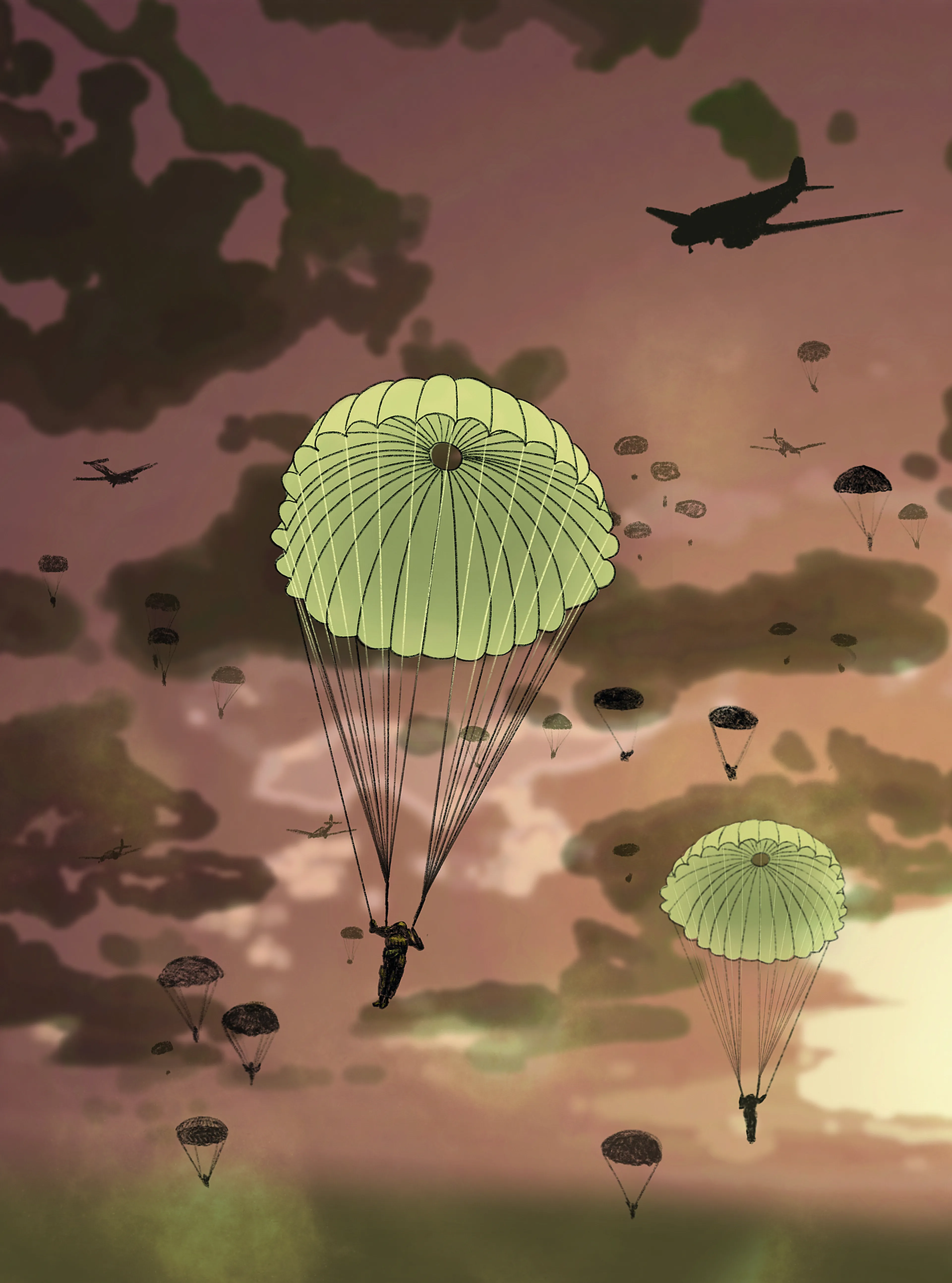 “Go! Go! Go!” Als een razende beginnen ze voor me te rennen op het moment dat het luik opengaat. Het vliegtuig uit, de inktzwarte duisternis onder ons in. Even voel ik de koude wind langs mijn gezicht. Ik kan de kou voor mijn idee haast ruiken. Over vijf minuten ben ik beneden. Samen met de jongens. Bij mijn landing op Sicilië, bijna een jaar geleden, brak ik mijn been. Dat gaat me niet weer gebeuren. Niet aan denken nu, John, dit keer kom je gewoon met beide benen op de grond. Als 31-jarige – en daarmee de oudste van mijn compagnie – voel ik me extra verantwoordelijk voor de rest. Samen zijn we op ons best. En dan ook echt top of the bill. Dat heeft officier Sobel ons wel laten merken, uiteindelijk.