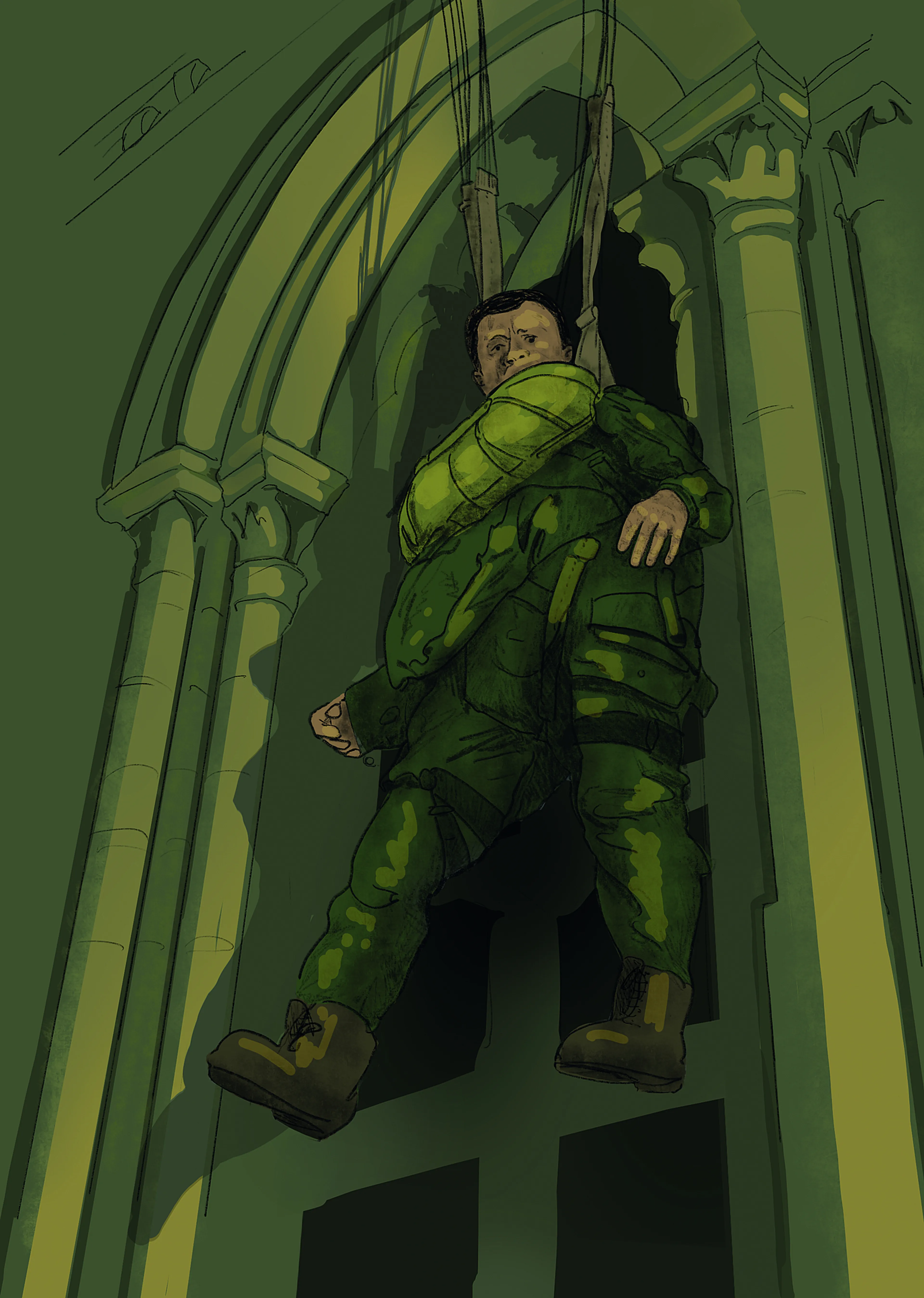 Het gewiebel wordt sterker. Ik voel me misselijk worden. Hoe kan dit? Wat gebeurt er? Ik kijk omhoog naar het venster in de toren en zie twee handen met een mes aan mijn parachute snijden. Een flinke ruk aan mijn parachute en dan val ik prompt een paar meter naar beneden. Weer blijf ik hangen. Er is één koord van mijn valscherm gebroken, blijkbaar. Nog een ruk en daar ga ik. Met een doffe dreun voel ik me op het dak van de kerk vallen. Ik grijp om me heen, maar vind nergens houvast.