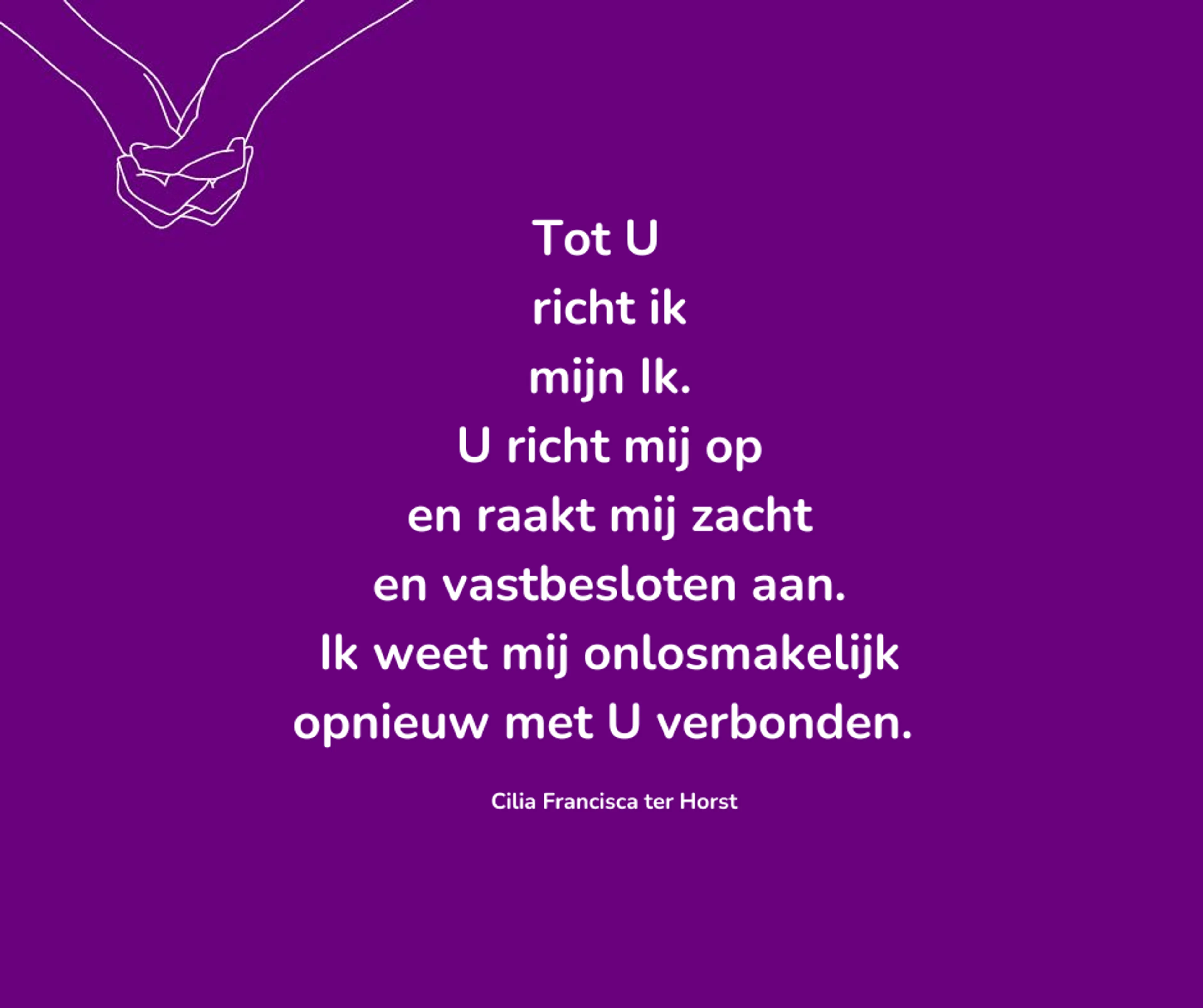 “Dit specifieke gebed is vrij kort. Ik denk dan ook dat we bij God niet al te veel woorden hoeven te spreken. Als ik bid, probeer ik Hem vooral de ruimte te geven. Het mooie aan dit gebed vind ik hoe God hierin naar voren komt als een betrokken God met wie je door het leven heen een band kunt opbouwen en verdiepen. Een band die in gouden en donkere momenten wel tegen een stootje kan. Zo ervaar ik dat zelf ook. Ik ben onlosmakelijk met Hem verbonden.”