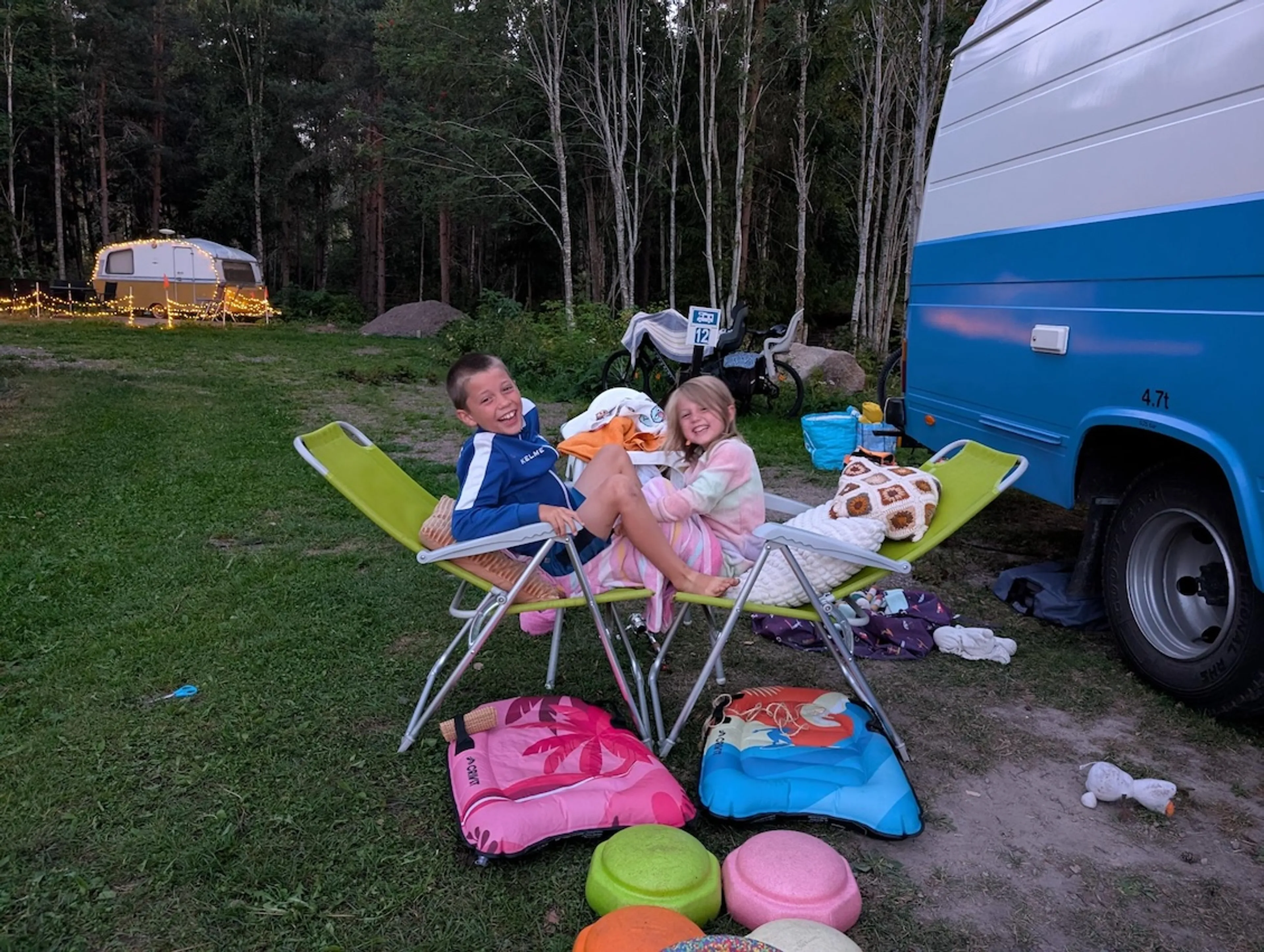 We krijgen regelmatig terug van mensen die we ontmoeten dat ze het zo leuk vinden om te zien hoe onze kinderen spelen. En hoe weinig ze daar eigenlijk voor nodig hebben. Ze vinden plezier in twee schommels die hangen in een boom en in een riviertje die langs de camper kabbelt. Van papier worden kleren gemaakt voor alle knuffels en een glazen pot wordt een aquarium. Alles komt tot leven. En ik moet af en toe slikken omdat de hele camper dan bezaaid ligt met knutselspullen en de kids allang weer weg zijn om te spelen met hun nieuwe creaties. Maar ik geniet van hun eindeloze fantasiewereld en mag ze leren achterom te kijken en zorg te dragen voor hun spullen.