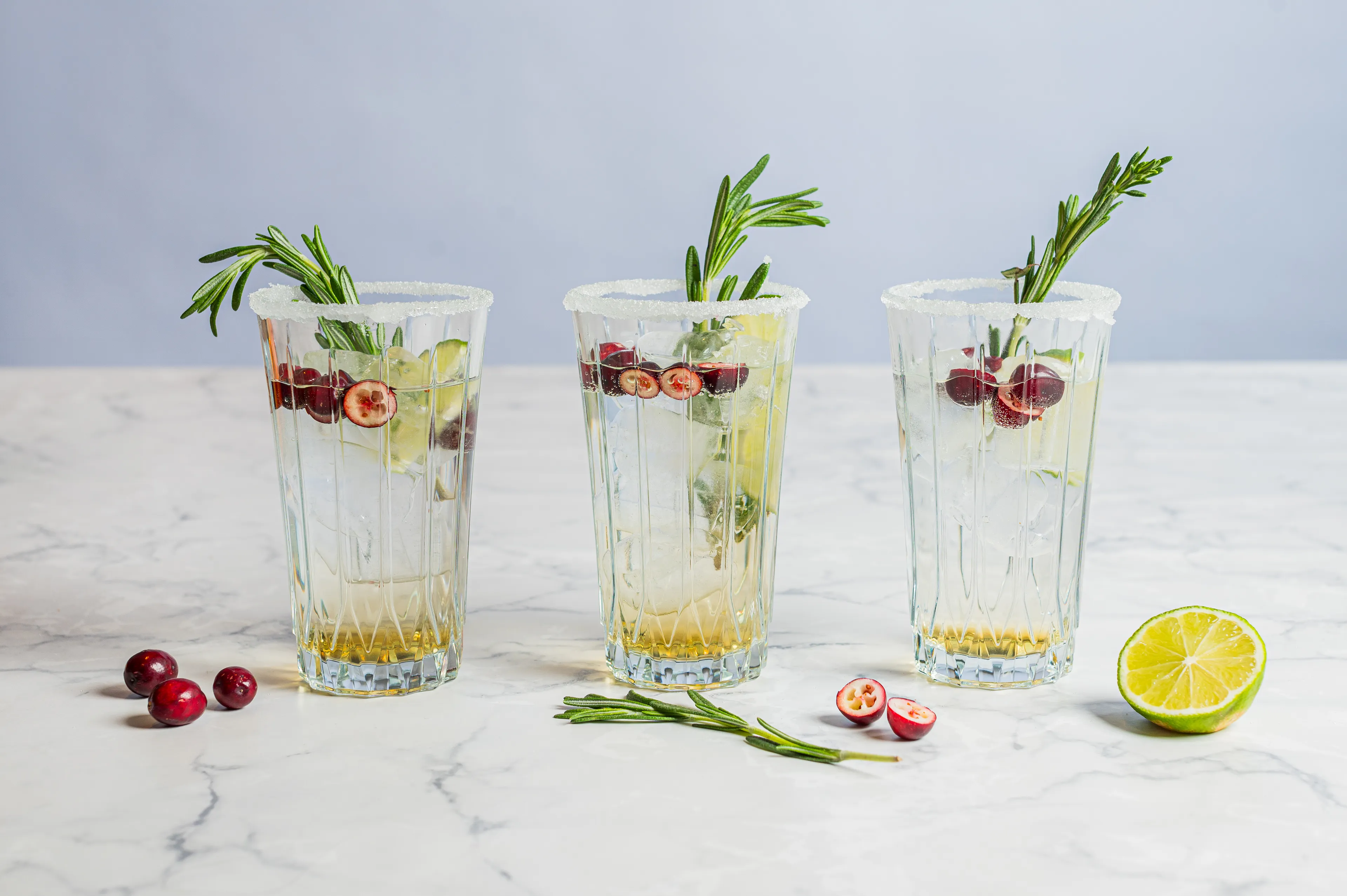 7. Voeg tot slot cranberry’s, twee partjes van de limoen en een takje rozemarijn toe als decoratie.