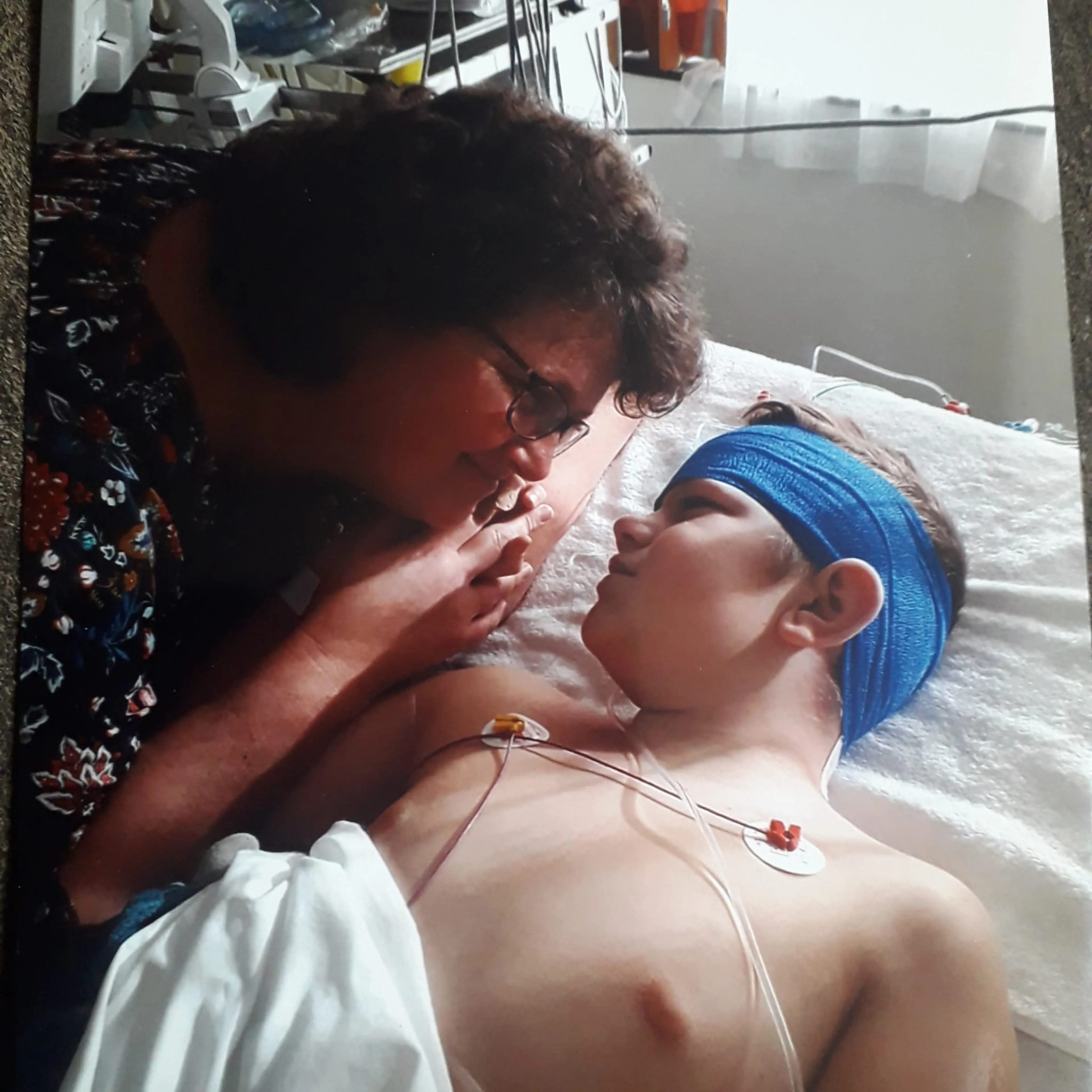 Vanaf dat moment gaat alles in sneltreinvaart. Jos wordt geopereerd en moet herstellen in het ziekenhuis. “De artsen en verpleegkundigen legden alles op een kinderlijke manier uit, zodat hij het ook begreep. Ze hebben ons heel goed begeleid, dat vond ik erg mooi.” Wanneer hij ontwaakt uit zijn operatie is Jos’ kortetermijngeheugen tijdelijk weg. “Hij wist niet meer dat ik zijn mama was. Dat vond ik heel confronterend. Hij was toen negen jaar en moest alles opnieuw leren: zitten, lopen, eten…”