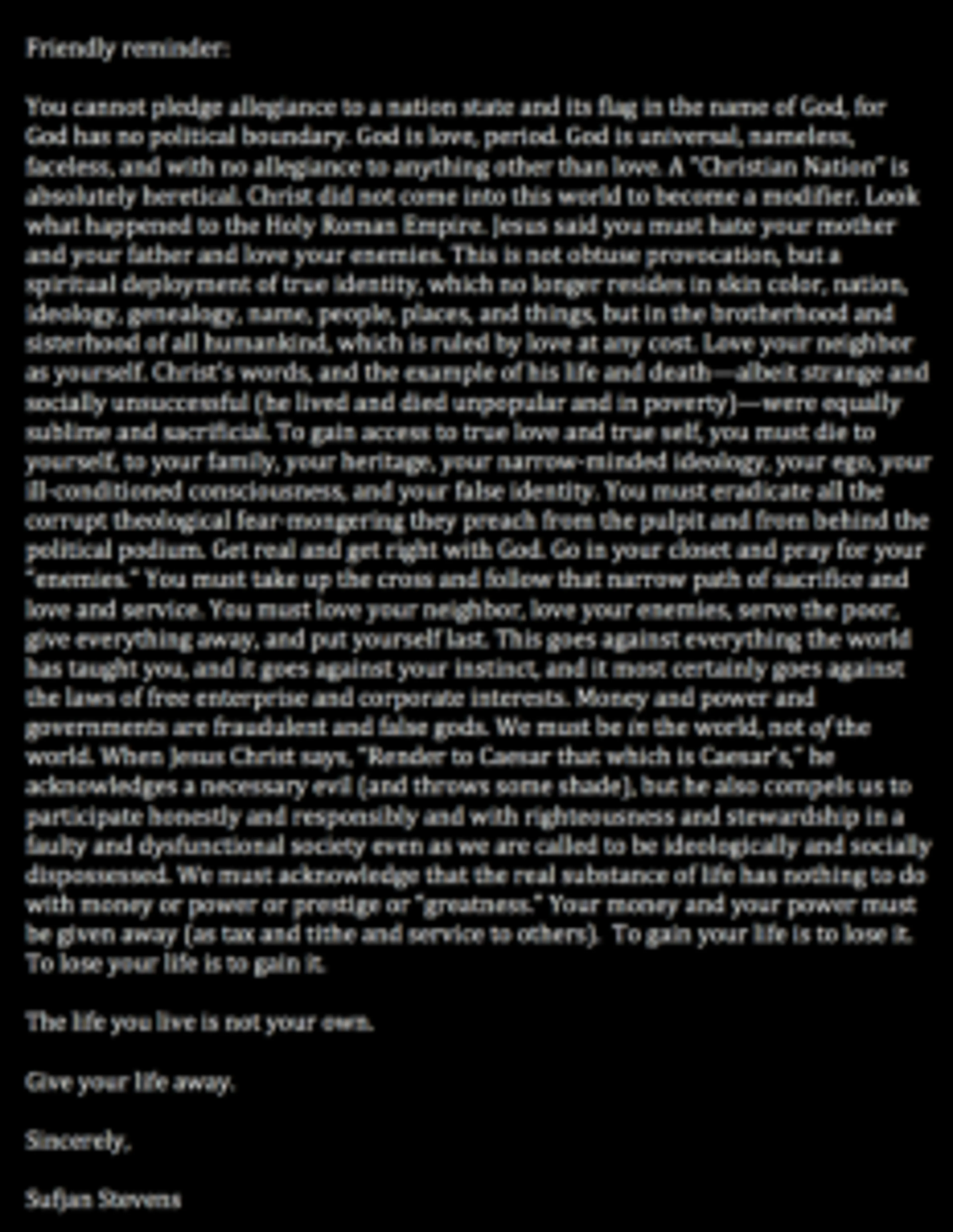 Ik vond mijn Jezus bij de zanger Sufjan Stevens – niet in een van zijn ogenschijnlijk zoetgevooisde liedjes, maar in een blog op zijn site. Over een Jezus die zegt dat je je moeder en vader moet haten en je vijanden moet liefhebben. Liefde tegen elke prijs. Je kruis op je nemen, sterven aan jezelf. Je leven verliezen om het te behouden. Want het leven dat we leven is niet van onszelf.