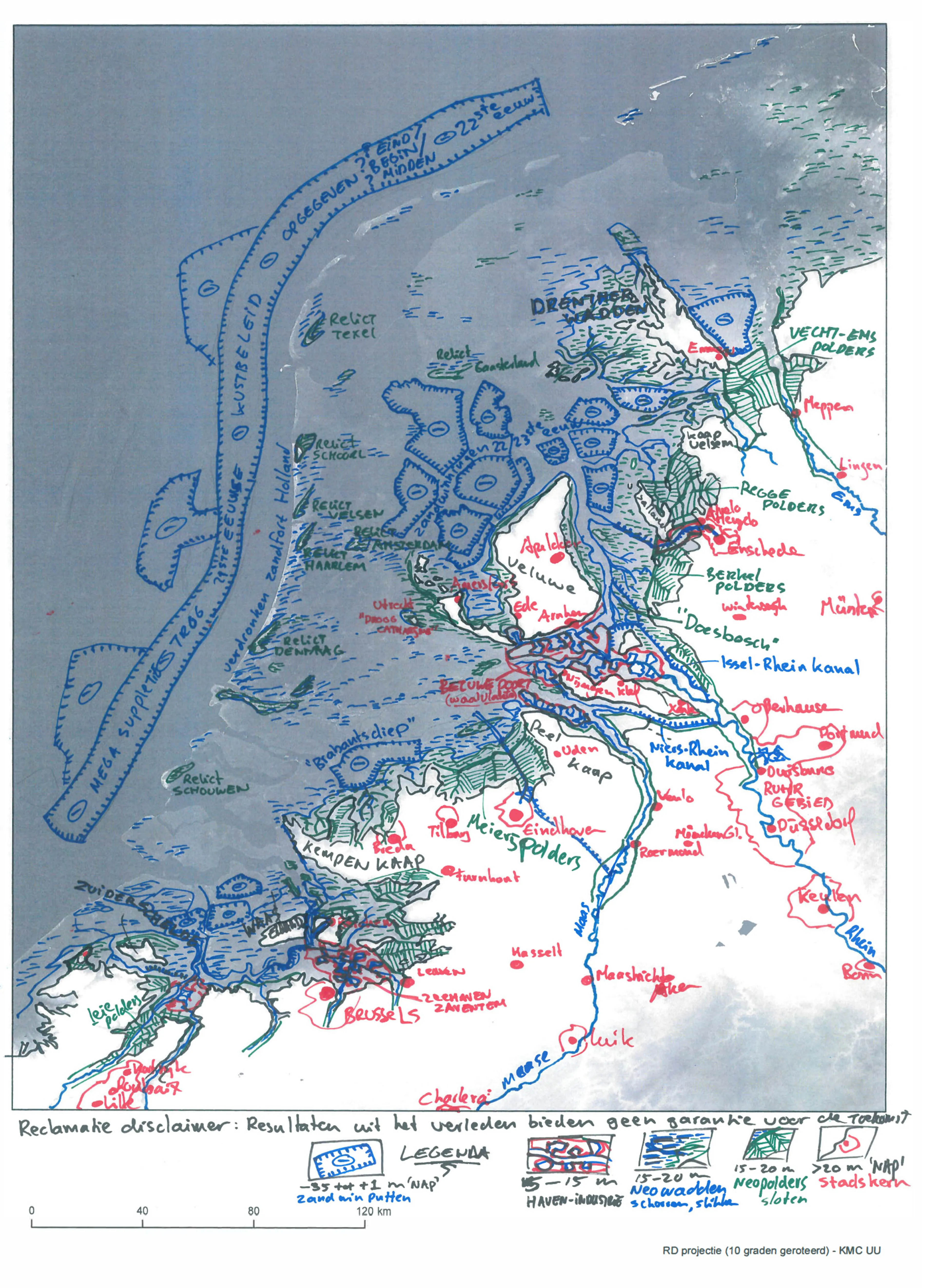 Met zijn scenario schetst dr. Kim Cohen een eindbeeld. Dit is geen kaart van ‘terugkrabbelen na een onvoorziene catastrofe’, maar laat het zien hoe Nederland zonder grote rampen door geleidelijke ontwikkelingen vanaf 2100 zal veranderen.