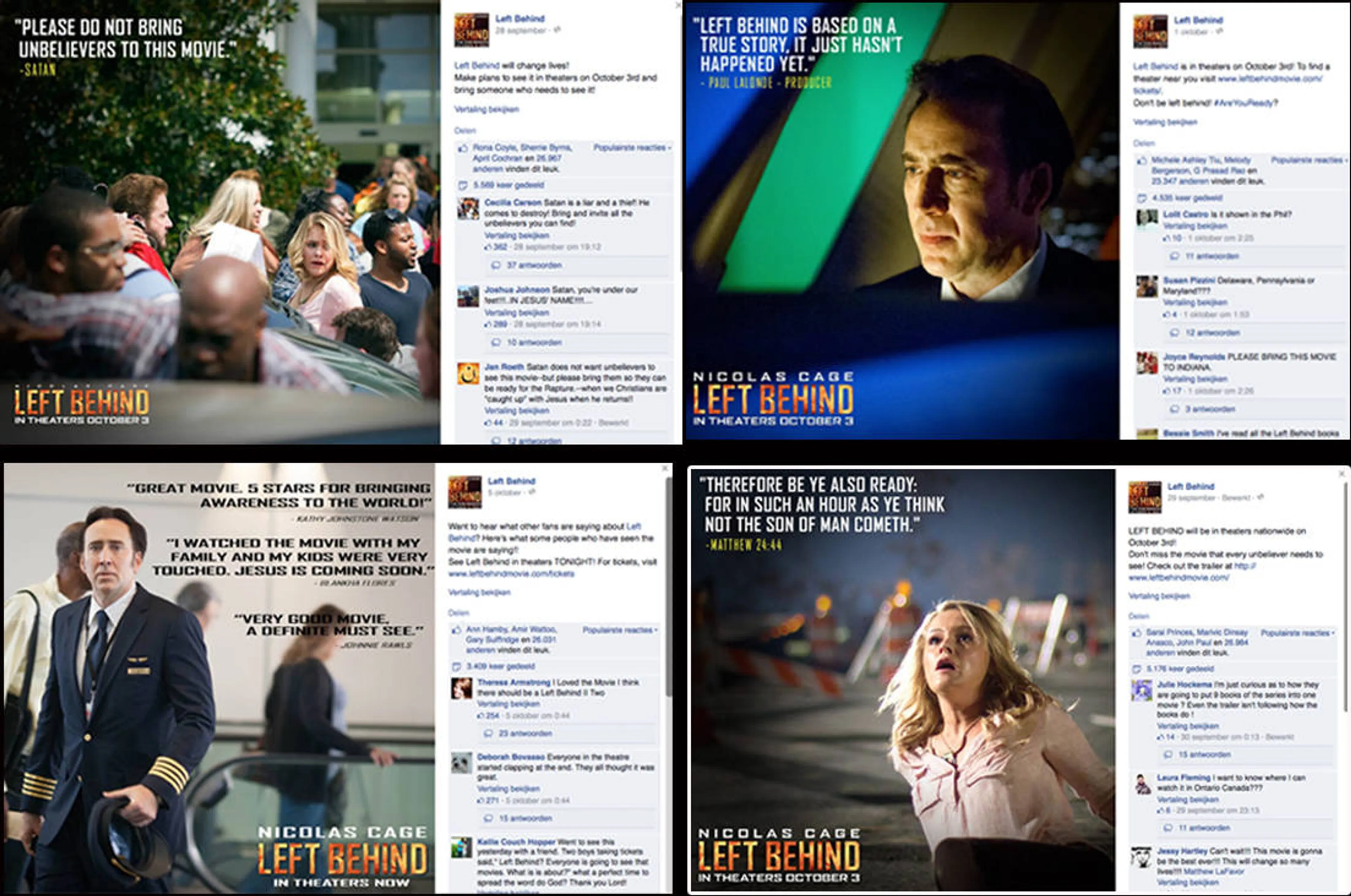 De langverwachte verfilming van de eindtijd bestsellerreeks 'Left Behind' is vanaf 20 november in de Nederlandse bioscoop te zien. Acteur Nicolas Cage speelt een hoofdrol in het verhaal waarin de Apocalyps plaatsvind. Een week na de Amerikaans première gaat het gesprek op social media vooral over de spraakmakende marketingcampagne èn het 'waarheidsgetrouwe gehalte' van de film.