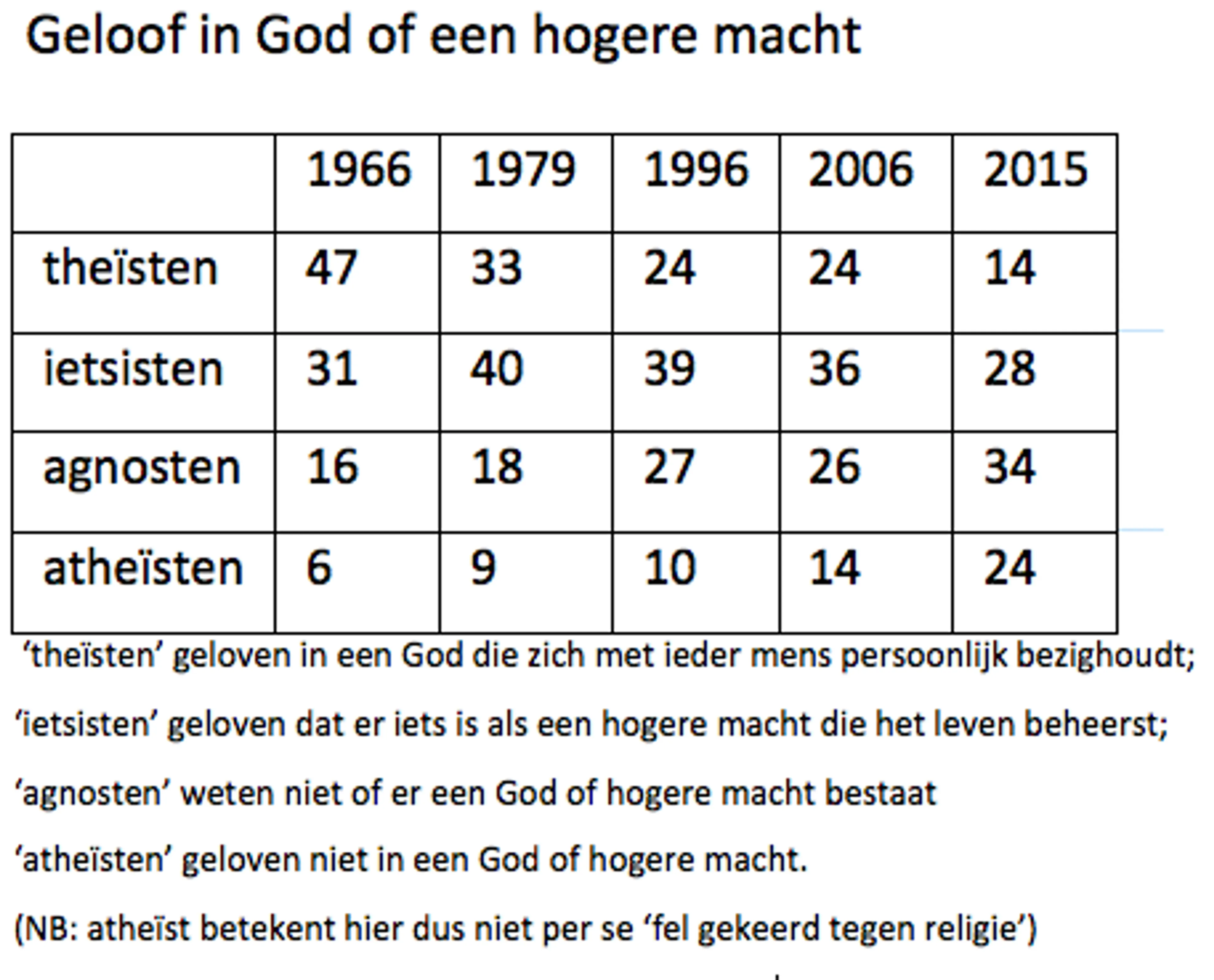 Een overgrote meerderheid van de Nederlanders (82%) komt nooit of bijna nooit in de kerk en nog maar veertien procent gelooft in een persoonlijke God. Voor veel Nederlanders is het christendom een onbekende of exotische wereld geworden. Bijna een kwart van de ondervraagden noemt zichzelf atheïst, dat was in 2006 nog veertien procent. Het aantal Agnosten nam ook toe van 26 naar 34 procent. Daarmee zijn de 'ongelovigen' (atheisten en agnosten samen) voor het eerst in de geschiedenis van dit onderzoek in de meerheid: 58%. Het aantal 'ietsisten' (die geloven in iets als een hogere macht) is gedaald, van 36 naar 28 procent.