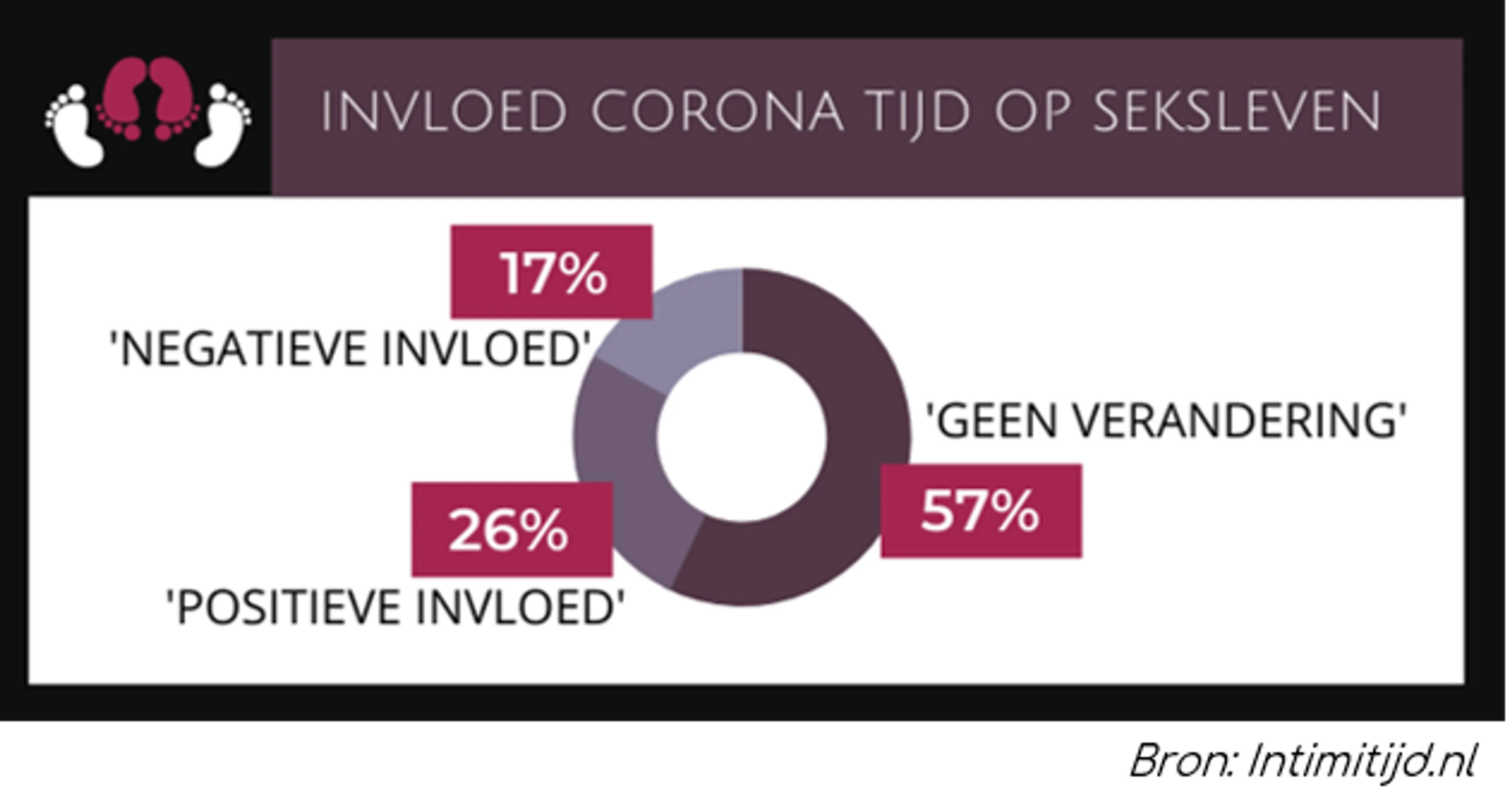 Het onderzoek* leverde een opvallend inzicht: maar liefst 26% van de respondenten geeft aan dat de invloed van de coronaperiode op zijn of haar seksleven positief is geweest, ten opzichte van de periode ervoor. Hier staat tegenover dat 17% van de respondenten aangeeft dat de coronatijd juist een negatieve invloed heeft gehad en 57% geeft aan ‘geen verandering’ te ervaren.