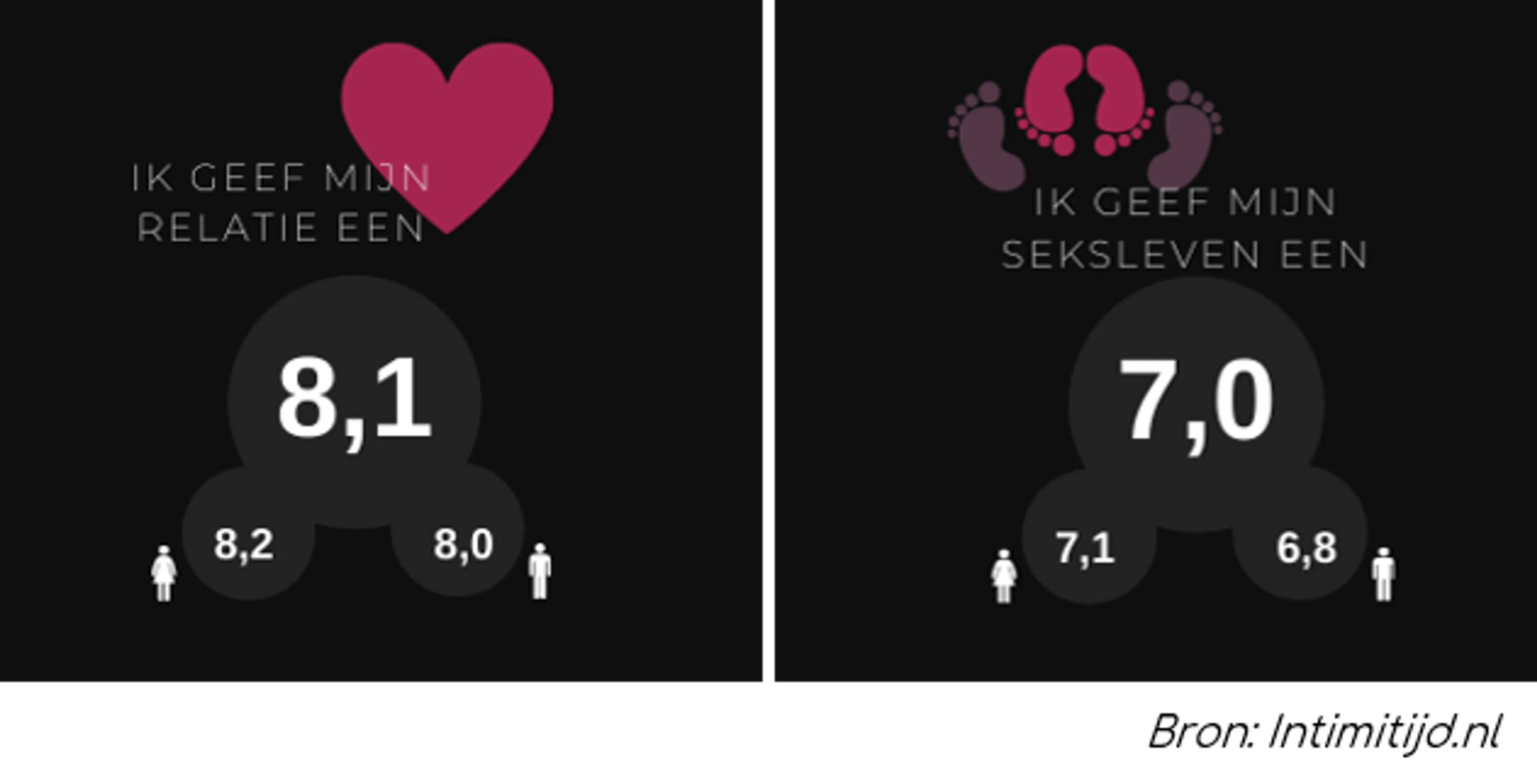 Over het algemeen waarderen mensen hun relatie met een significant hoger cijfer (8,1) dan hun seksleven (7,0). Wanneer we kijken naar de verschillen tussen mannen en vrouwen, dan valt op dat mannen zowel hun relatie als seksleven gemiddeld lager waarderen dan vrouwen. Mannen geven hun seksleven gemiddeld een 6,8 en vrouwen waarderen hun seksleven met een 7,1.