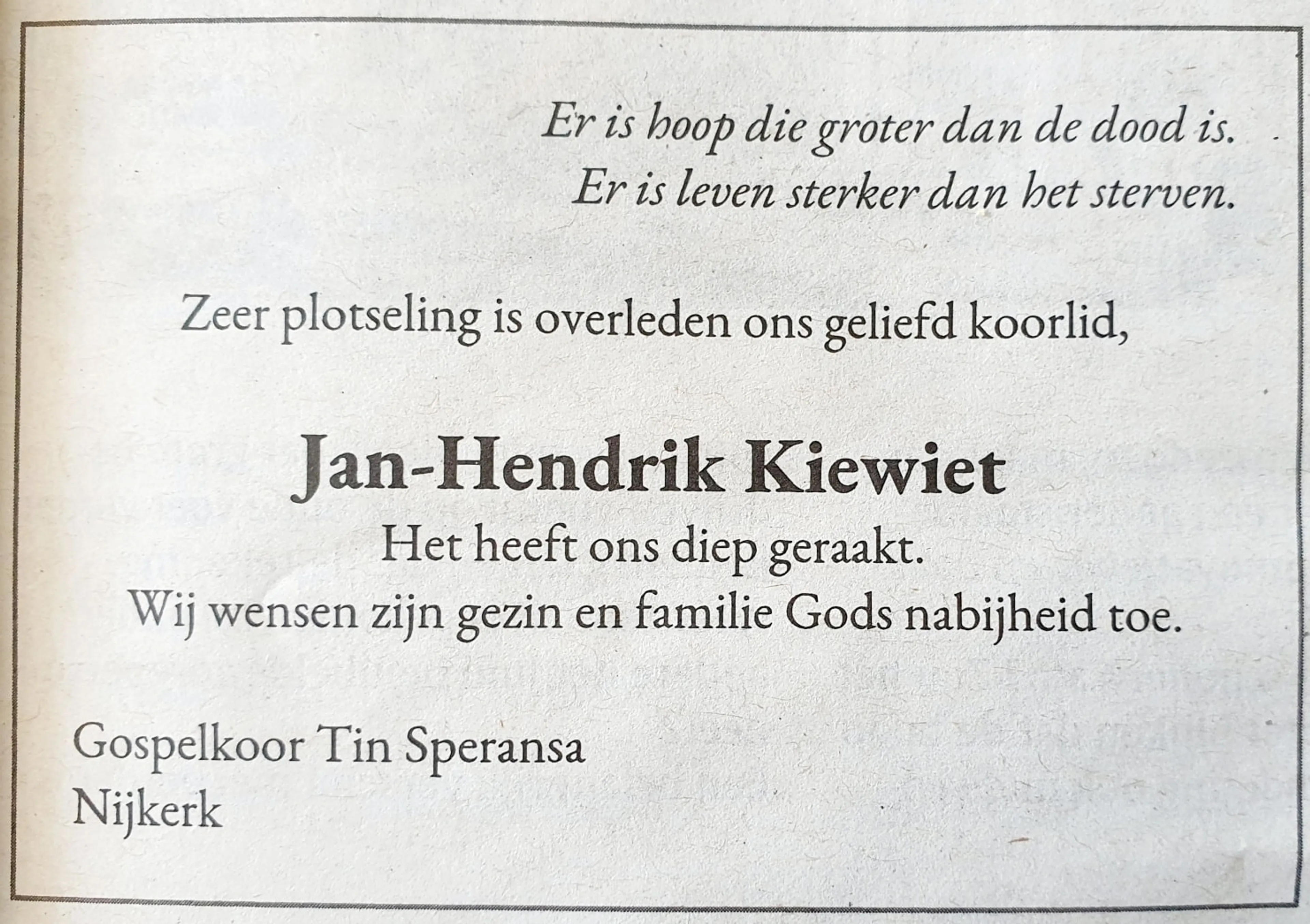 Een paar weken geleden liet Jan-Hendrik Kiewiet via Zoom een lied horen aan de leden van het gospelkoor Tin Speransa. 'Er is hoop, die groter dan de dood is'. Vorige week overleed hij plotseling. Omdat de koorleden vanwege de coronamaatregelen niet bij de begrafenis kon zijn, wilden ze de familie op een andere manier steunen. Ze maakten een videoclip van het lied dat koorlid Jan-Hendrik zo mooi vond.
