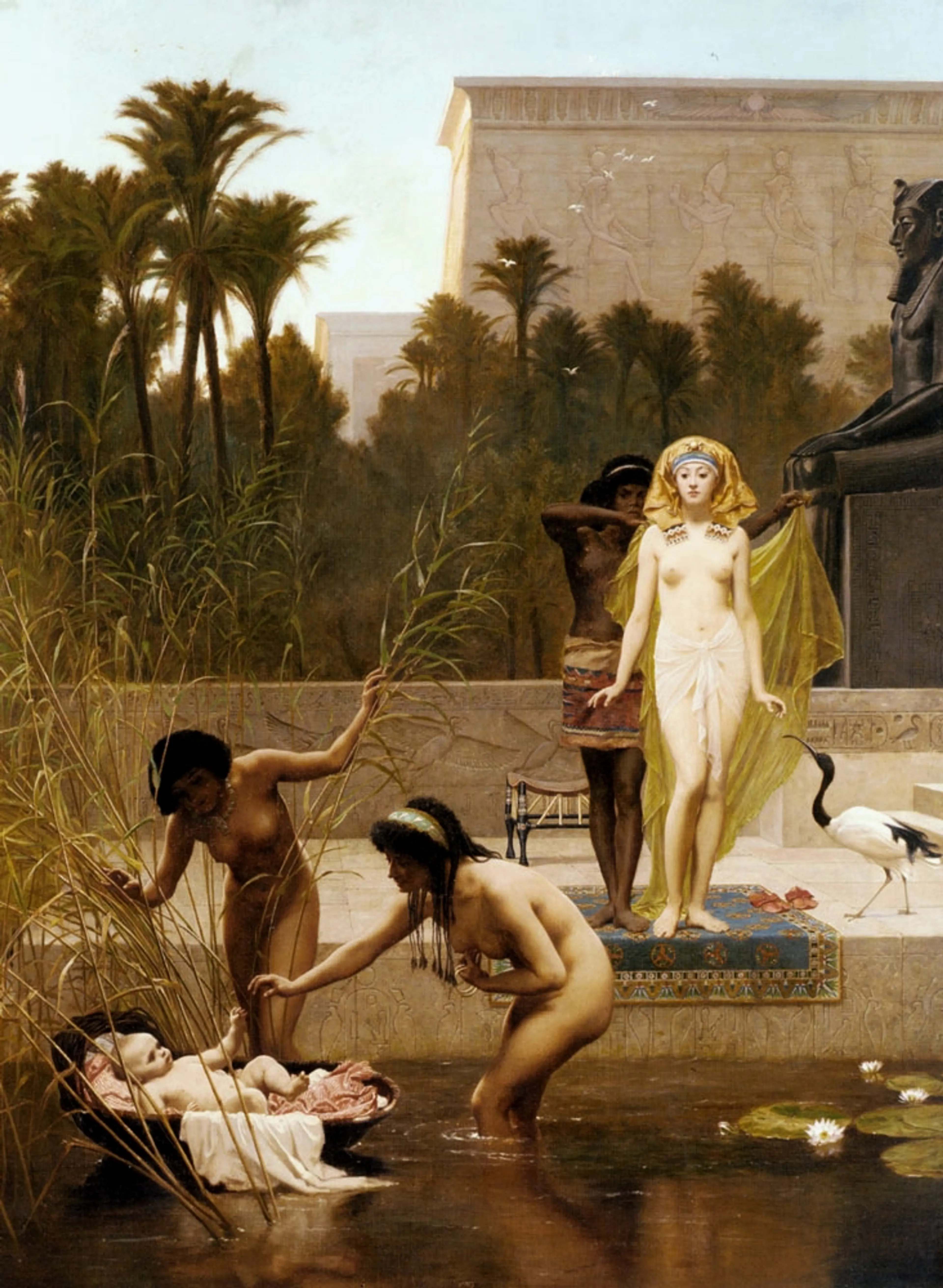 De Egyptische prinses, die Mozes uit het water haalde, staat centraal in een schilderij van de Britse Frederick Goodall uit 1885: The Finding of Moses. Het schilderij laat de Egyptische prinses zien die met haar bedienden aan het baden is en het mandje met Mozes erin vindt. ‘In die tijd waren er allerlei opgravingen in Egypte en was er heel veel interesse in Egypte voor Europa’, vertelt Lieke ‘Die interesse werd gebruikt om zo authentiek mogelijk een Bijbelverhaal te laten zien.’ Lieke wijst erop dat het wel een heel Victoriaans schilderij is: door de verbeelding van de prinses, maar ook door het vele naakt. ‘De vader van de prinses van Egypte geeft dus opdracht tot een genocide. En zij vindt een baby die dood zou zijn volgens het bevel van haar vader en besluit om hem op te vissen uit het water. Zij geeft hem ook zijn naam. In het Hebreeuws betekent Mozes opgeviste, in het Egyptisch ‘zoon van’.’