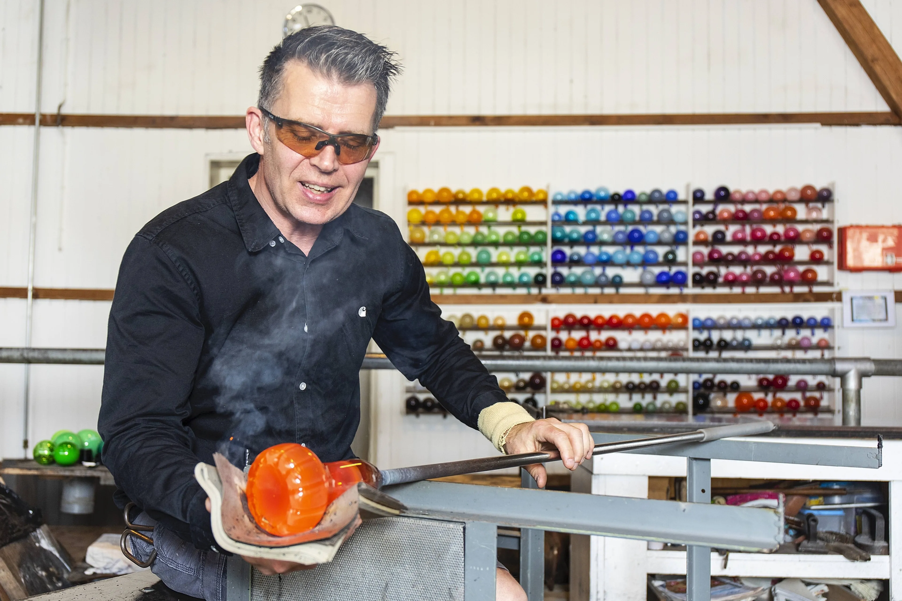 Hij zette een punt achter zijn prille lascarrière en begon helemaal onderaan de glasblazers-ladder: als knecht. “Dat hield in: pijpen kloppen, om de glasrestanten eraf te slaan, vormen open- en dichthouden voor de glasblazers, dat soort werk. Het leuke daarvan was dat je op een gegeven moment gaat zien wat er goed gaat op de werkvloer, en wat niet. Want je overziet het hele proces en gaat alles steeds beter snappen. Puur door te kijken, te observeren. Dat zeg ik nog steeds tegen mensen die ik opleid: kijken is ontzettend belangrijk. En vragen stellen, leren. Voordat je als glasblazer überhaupt iets zelf kunt maken, moet je trouwens minimaal tienduizend vlieguren maken.”