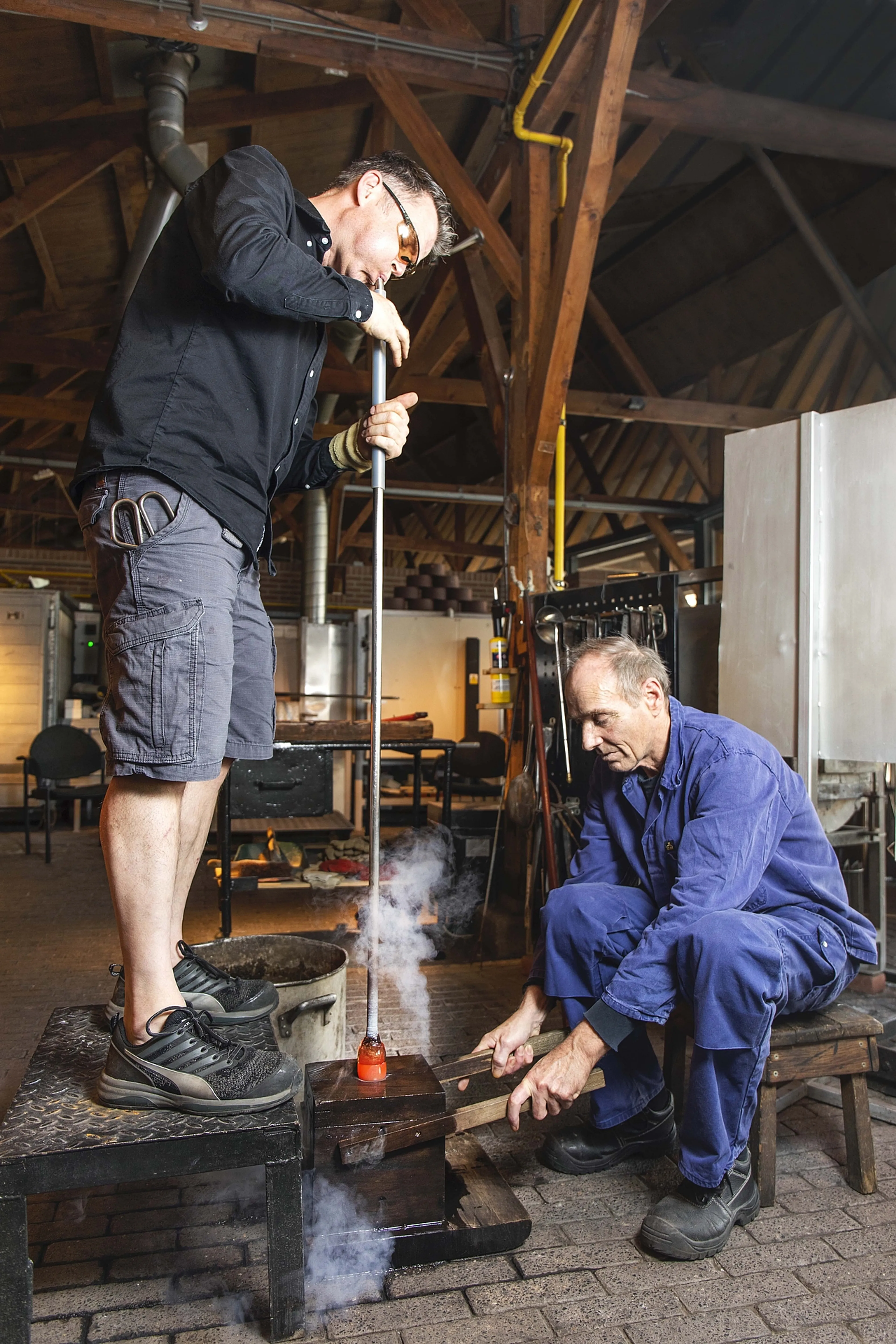 Het zijn iedere keer min of meer dezelfde stappen die ze zetten en handelingen die ze verrichten, maar beide meesterglasblazers doen het met plezier. Gert (zwart overhemd, korte broek, veiligheidsbril) en Henk (blauwe overall) zijn de afgelopen jaren zo goed op elkaar ingespeeld dat ze al aan een blik of opgetrokken wenkbrauw genoeg hebben om met elkaar te communiceren. Er komen dus weinig woorden aan te pas.