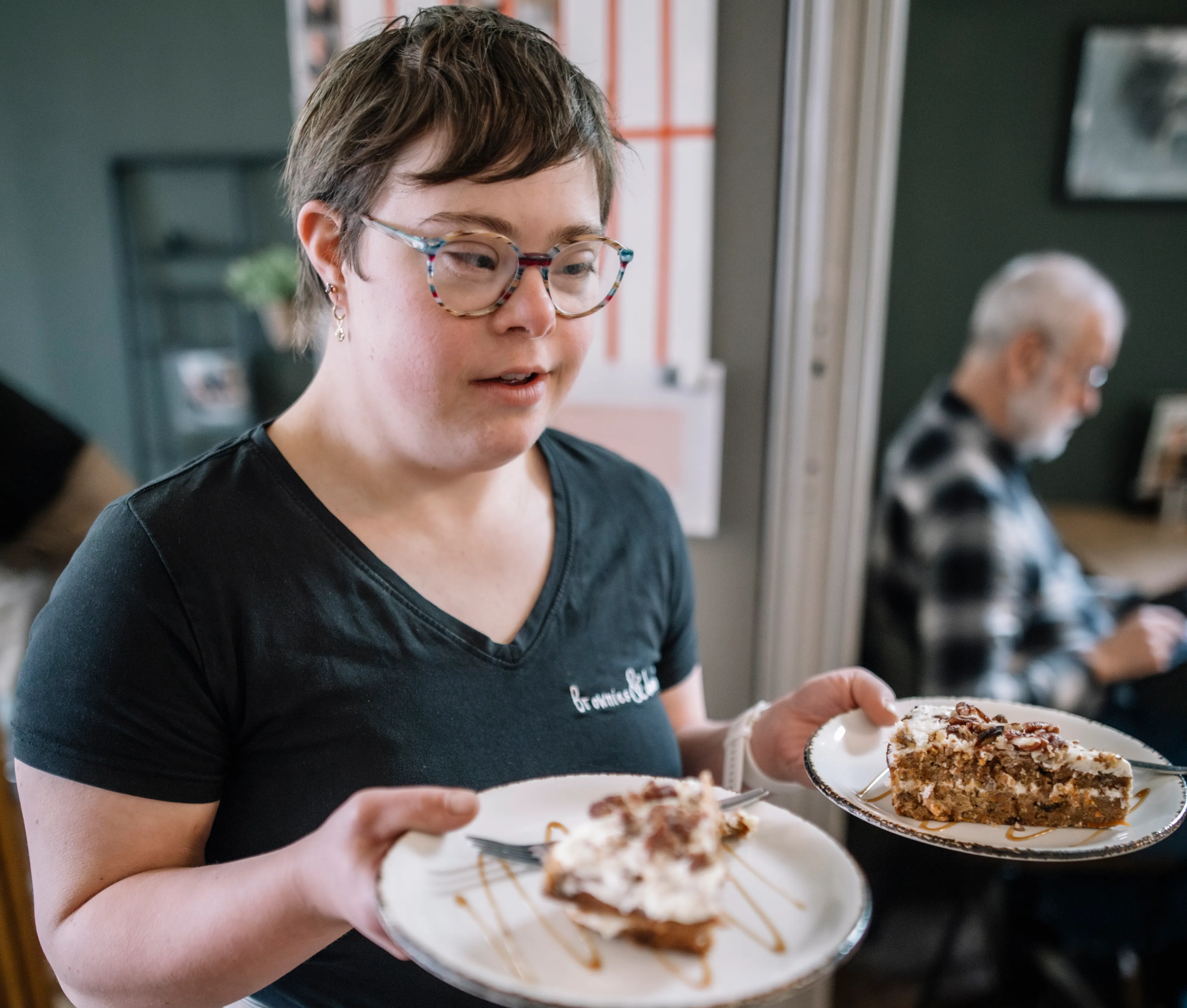 “Wil je meehelpen met afrekenen, Muriël?” vraagt begeleider Maud. “Leuk!” glundert Muriël (27), en opgewonden knijpt ze haar handen samen. Niet veel later zwaait ze de gasten met een gulle glimlach uit. “Heeft u gereserveerd?” vraagt ze aan twee nieuwe klanten die in de hal staan. “Nee? Kom dan maar mee”, en met een zwaai trekt Muriël de glas-in-looddeur open. Toch wel een beetje trots begeleidt ze hen naar een tafeltje. Als ze me ziet kijken, knijpt ze haar ogen achter haar vrolijk gekleurde bril tot spleetjes.