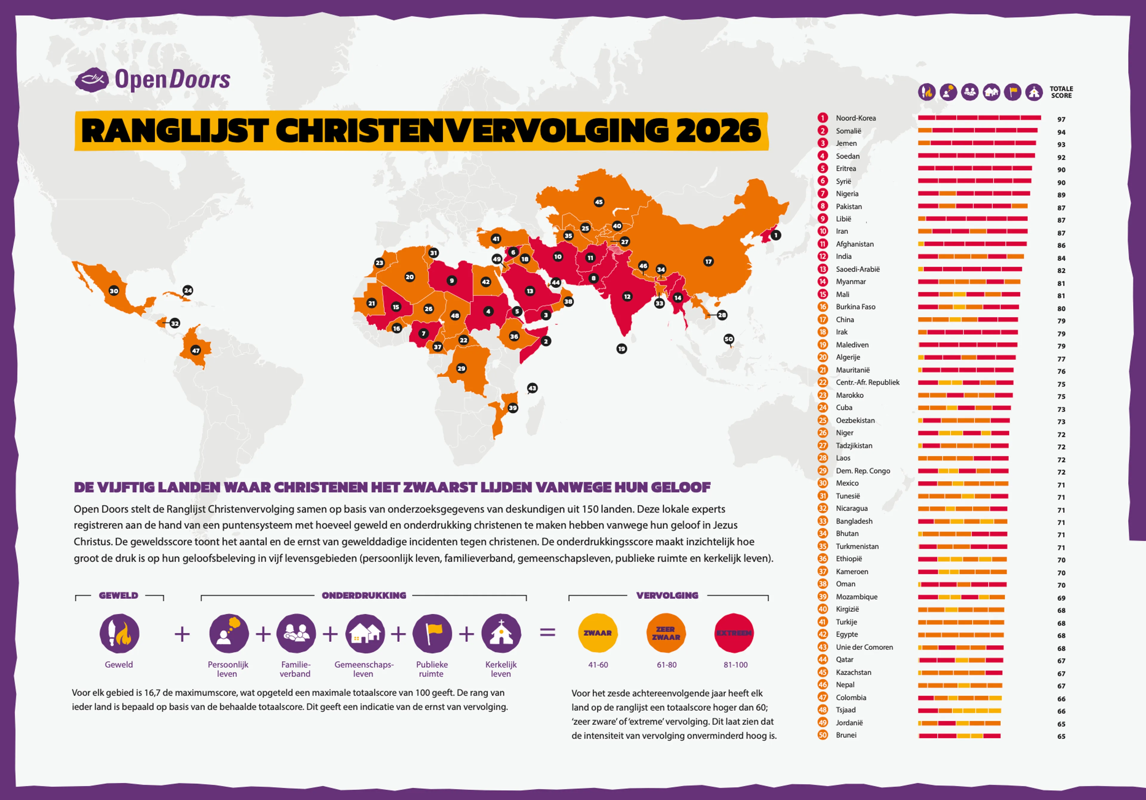 Open Doors hanteert drie niveaus van vervolging. Zware vervolging krijgt een gele markering, zeer zwaar oranje en extreme vervolging heeft een rood label. Sinds het ontstaan van de lijst zijn er nog nooit zoveel landen geweest met een rode markering. “Vroeger stonden er nog gele landen in de ranglijst. Maar door de toenemende intensiteit van christenvervolging verdween die categorie uit de top vijftig. Dit jaar zijn er vijftien landen met een rood label. Dat is teleurstellend maar bovenal zorgelijk.”