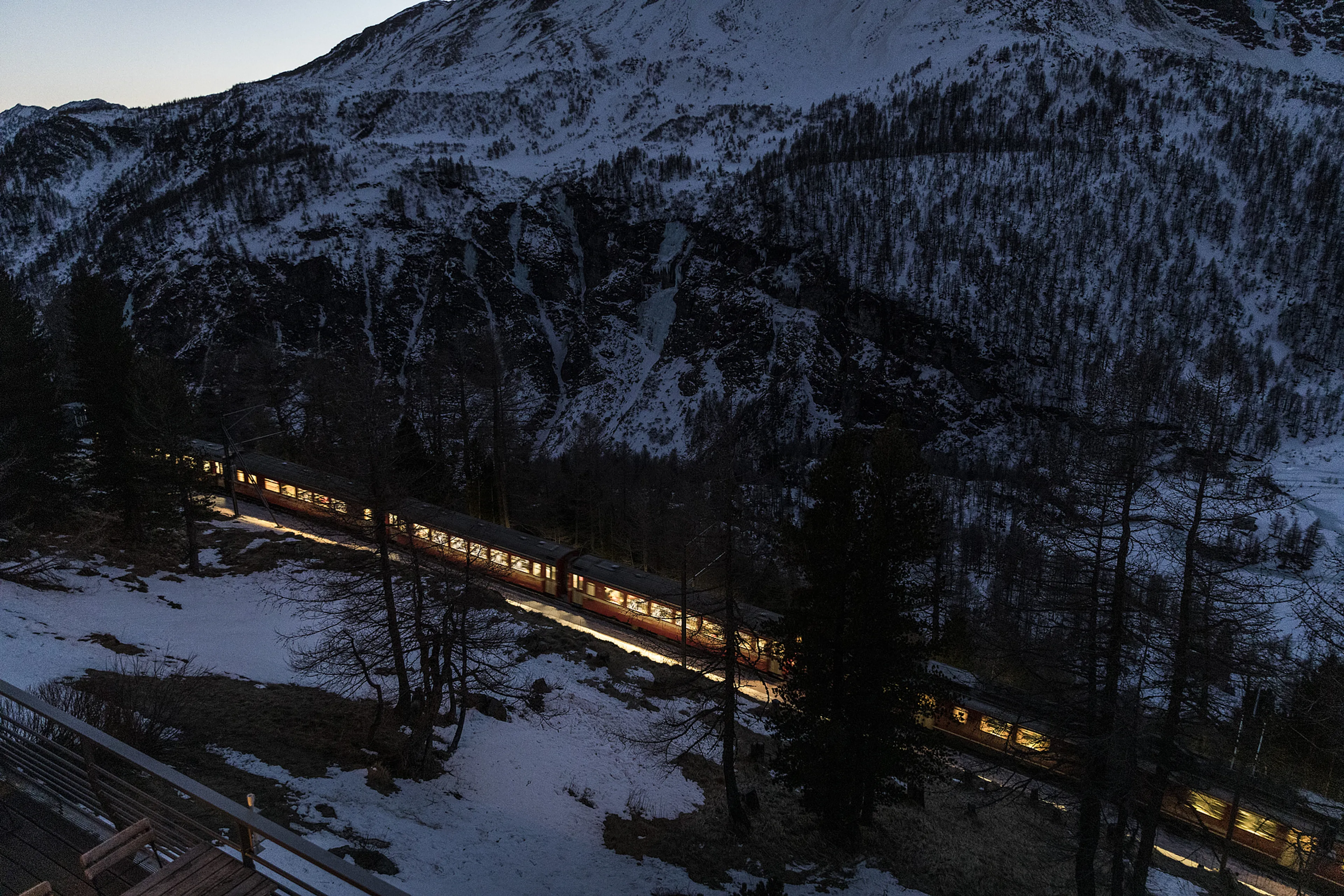 Na een lange, maar ontspannen treinreis vanuit Nederland heeft de bekende rode trein van de Rhätische Bahn ons naar het station Punt Muragl gebracht. Het is dag drie van onze trip en samen met fotograaf Ruben Timman ben ik op weg naar het mooiste uitzichtpunt van het Engadin, een langgerekt dal in Graubünden.