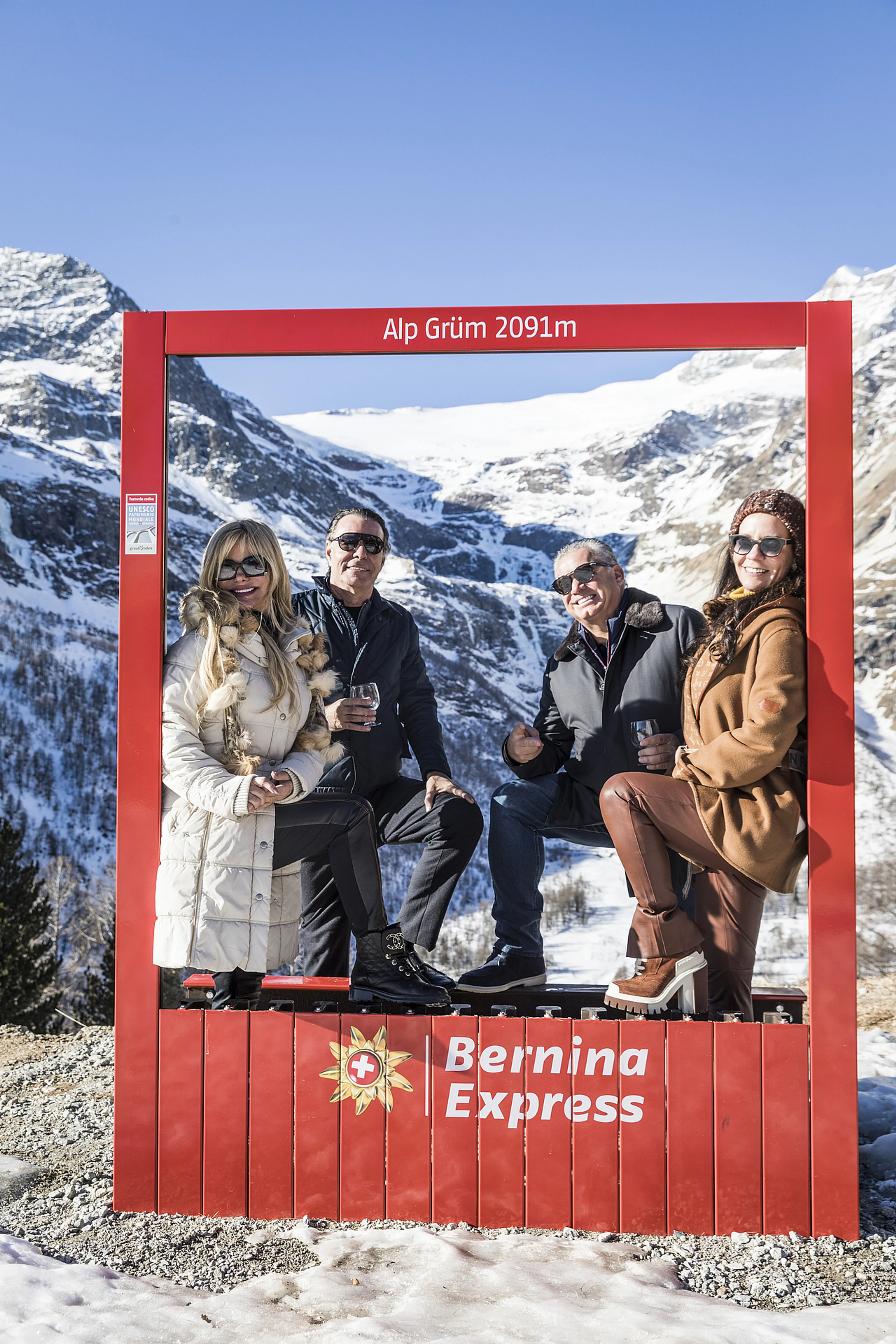 Op onze tweede dag gaan we vanuit Bergün op weg naar het zuidelijke Poschiavo. Onderweg maakt de trein op een prachtig uitzichtpunt in het hooggebergte een ‘fotostop’. We zijn op Alp Grüm, op 2091 meter hoogte. Hier zullen we ’s avonds terugkeren om te overnachten. We raken aan de praat met een groep Brazilianen. Ze stappen uit het panoramarijtuig, een glaasje witte wijn in de hand. Twee zoons van mensen uit het gezelschap, die in Zwitserland studeren, hebben hun familie uitgenodigd.